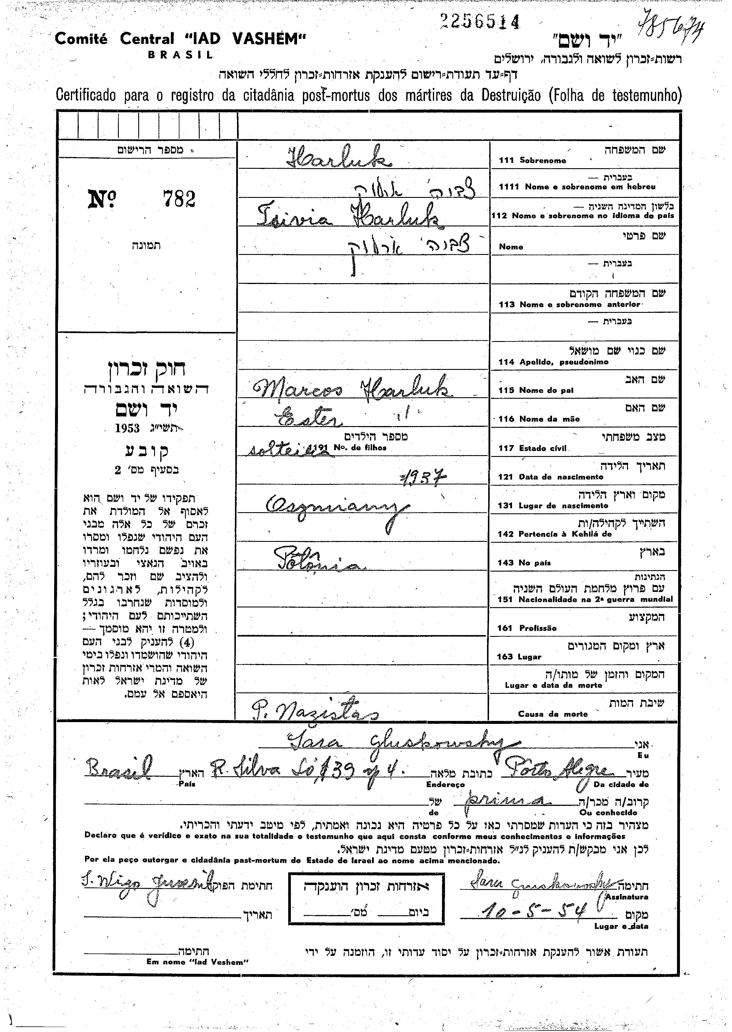 Harluk Tsivia 1937 Pologne Feuille de témoignage
