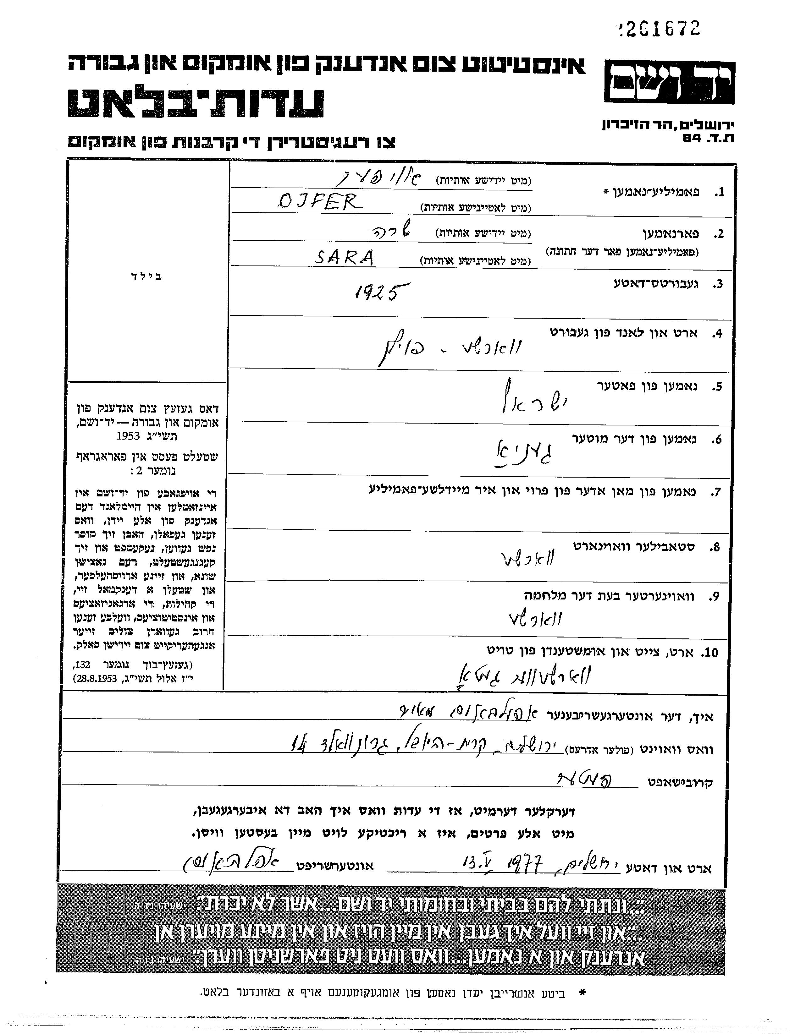 Ojfer Sara 1925 Warszawa, Pologne Feuille de témoignage