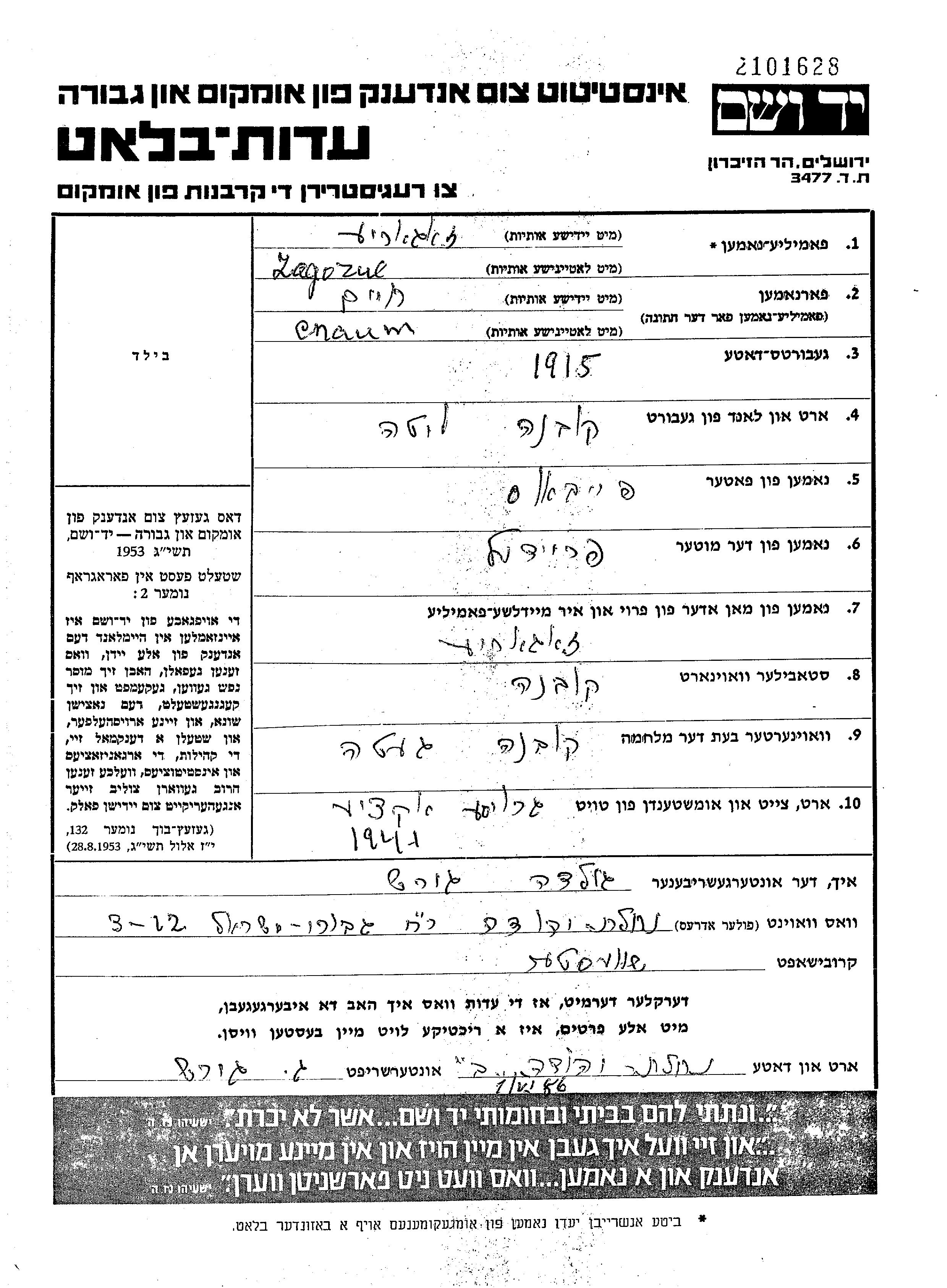 Zagorie Chaim 1915 Kowno, Lituanie Feuille de témoignage