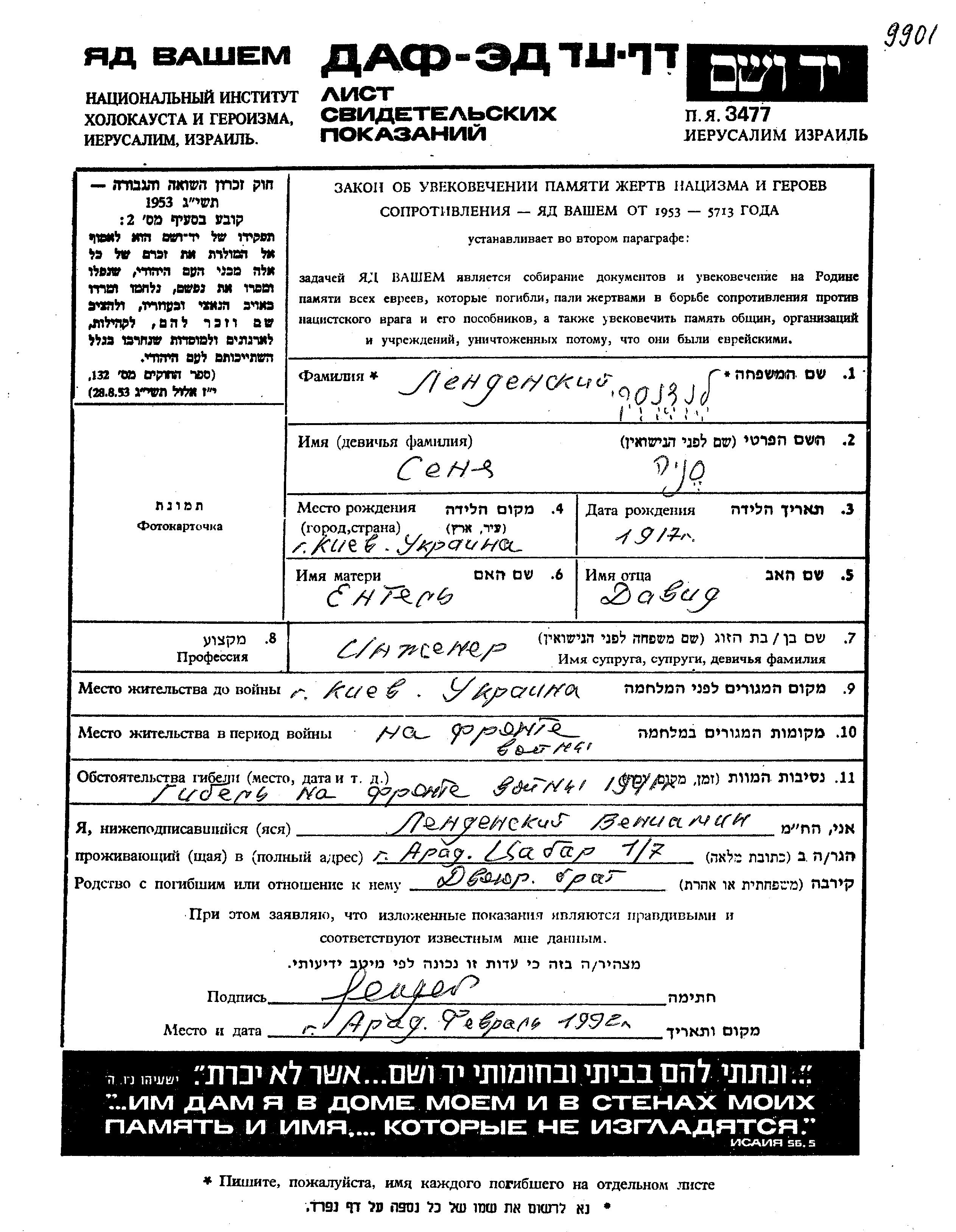 Lendenski Senia 1917 Kiyev, Ukraine (URSS) Feuille de témoignage