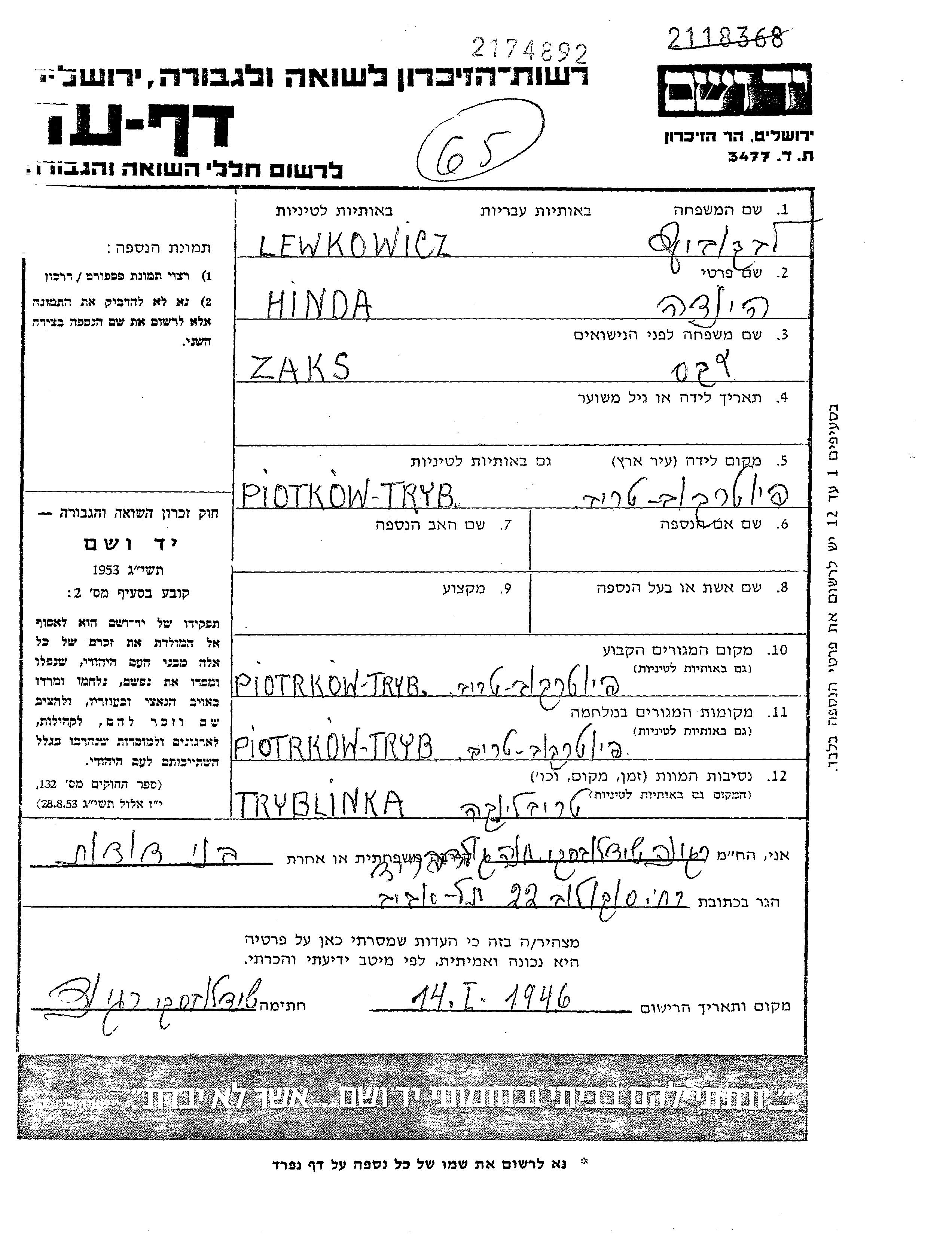 Hinda Lewkowicz née Zaks est née à Piotrkow Trybunalski, Pologne. Elle était Mariée à Mordekhai Yosef. Avant la seconde guerre mondiale elle vivait à Piotrkow Trybunalski, Pologne. Pendant la guerre, elle était à Piotrkow Trybunalski, Pologne.
