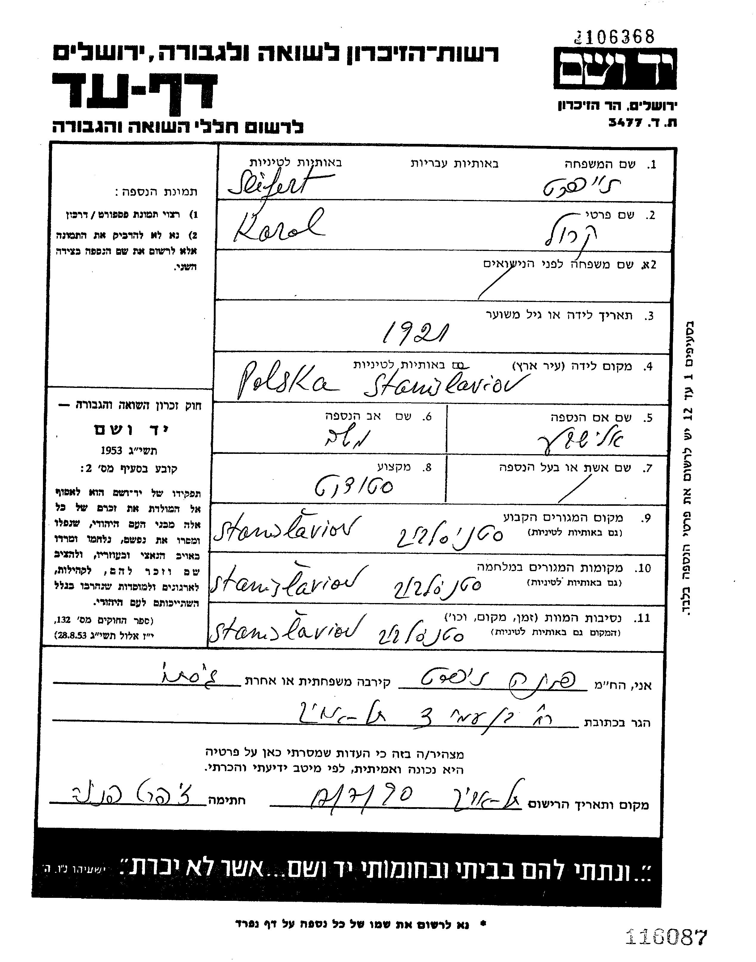 Seifert Karol 1921 Stanislawow, Pologne Feuille de témoignage