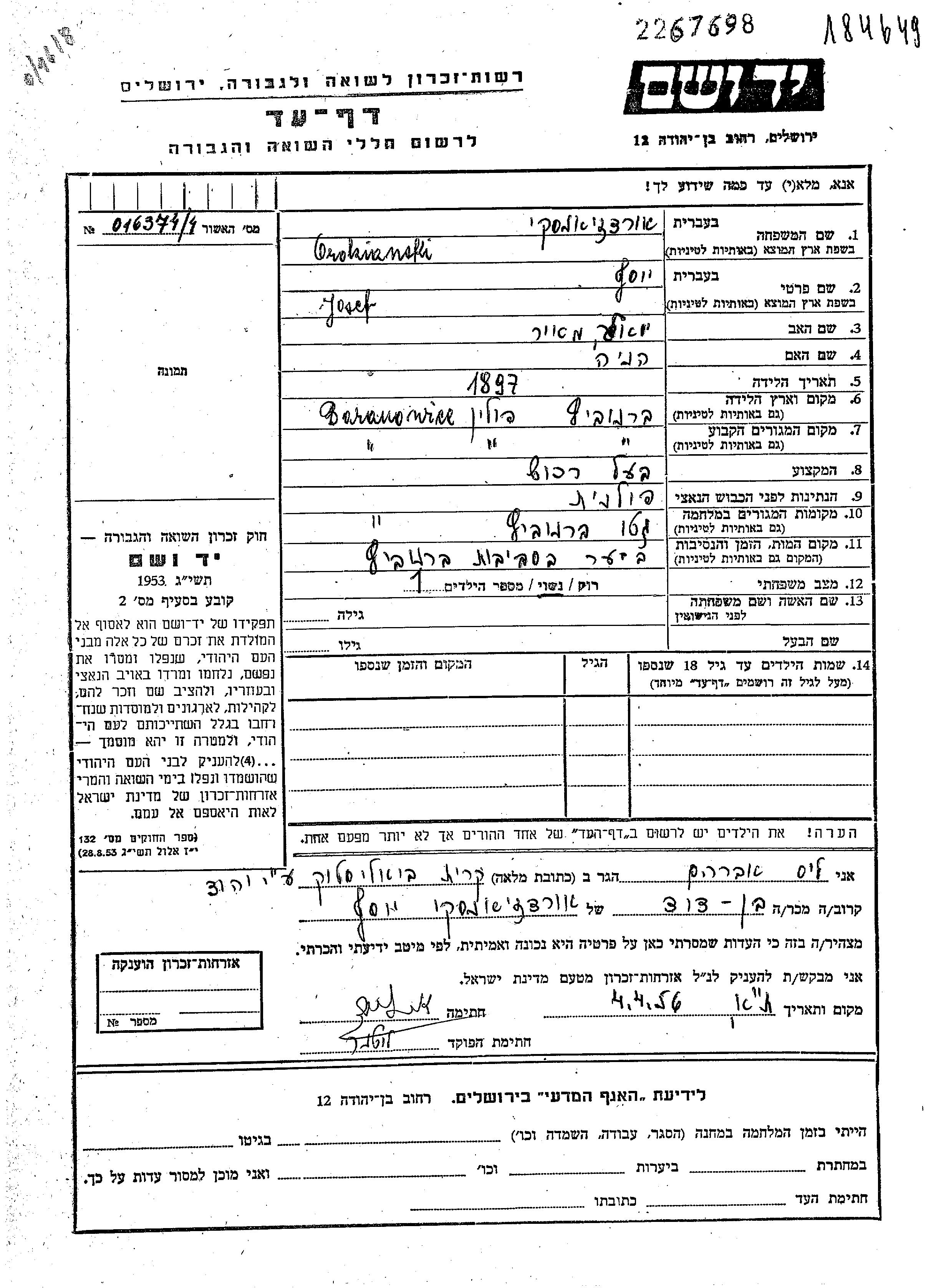 Ordzianski Josef 1897 Baranowicze, Pologne Feuille de témoignage