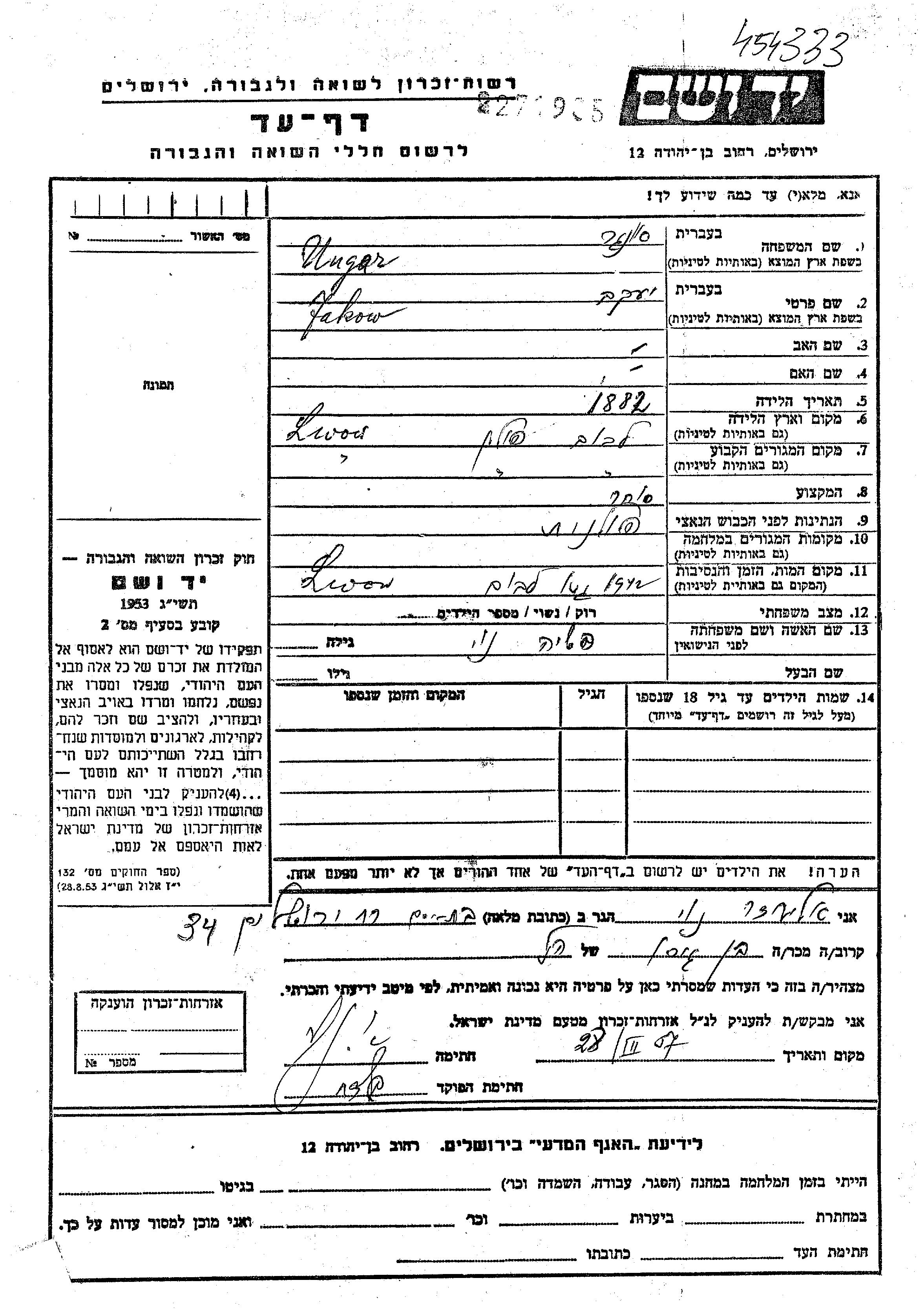 Ungar Jakow 1882 Lwow, Pologne Feuille de témoignage