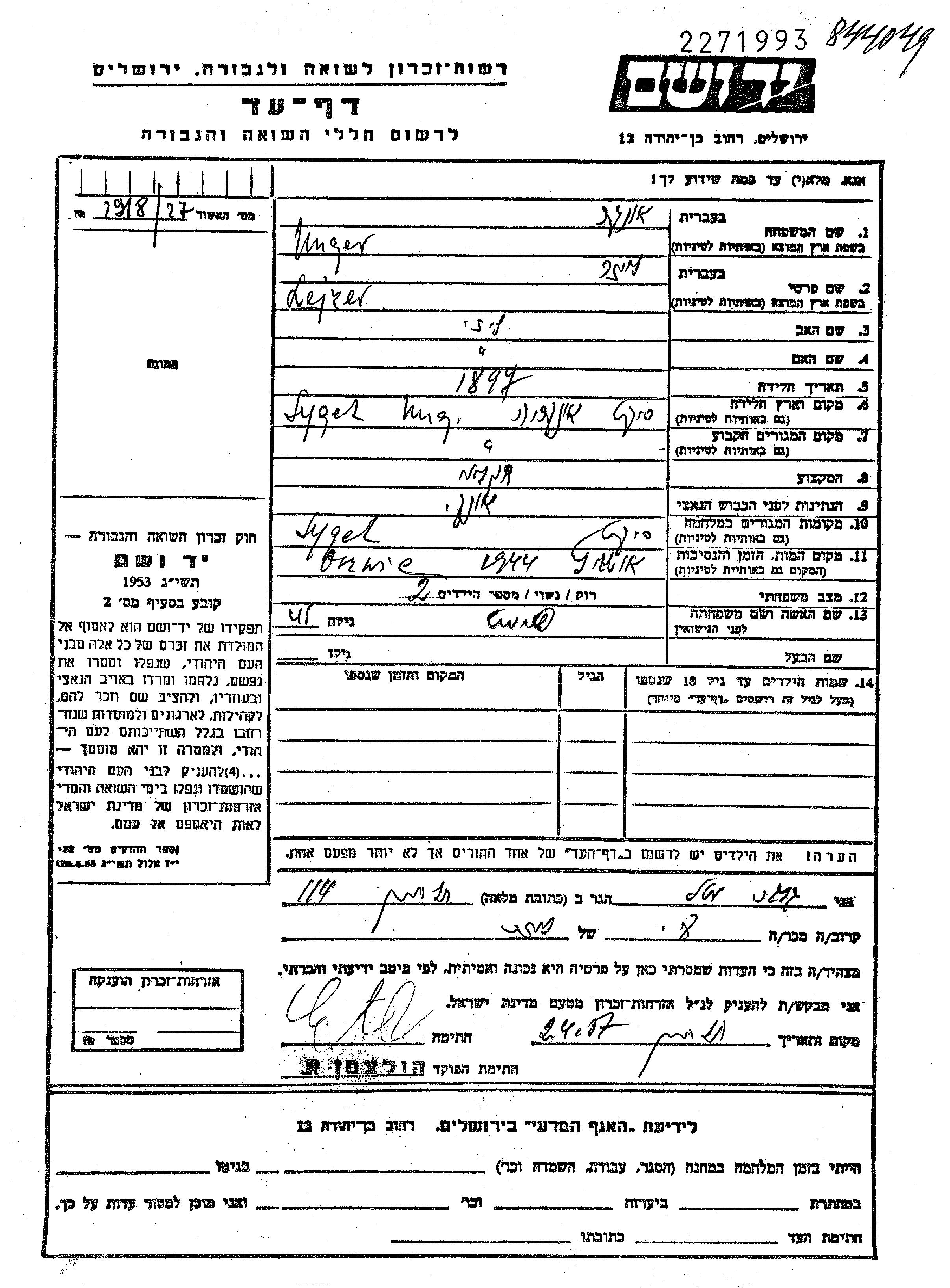 Unger Lejzer 1897 Sighet, Roumanie Feuille de témoignage