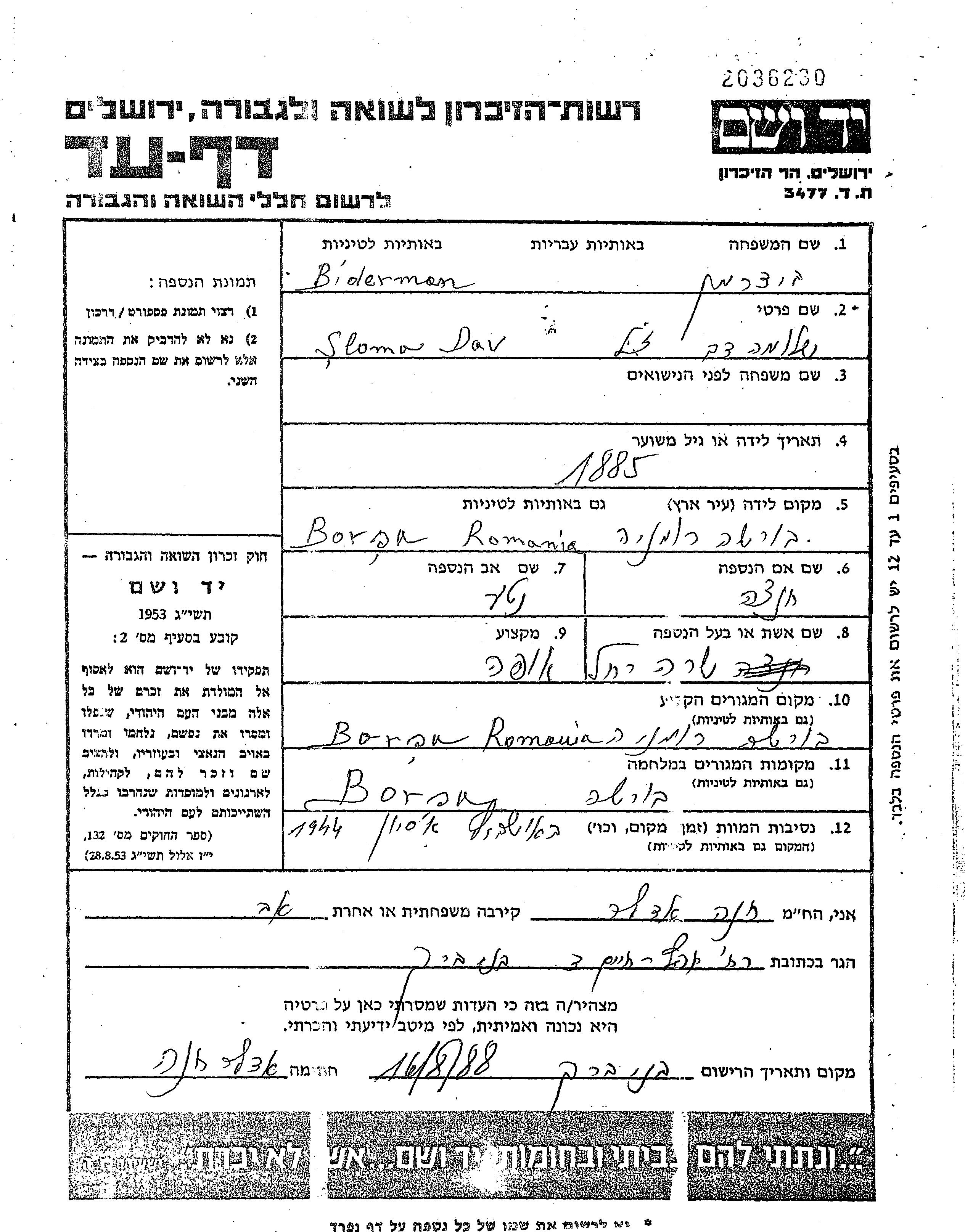 Biderman Shloma Dov 1885 Borsa, Roumanie Feuille de témoignage