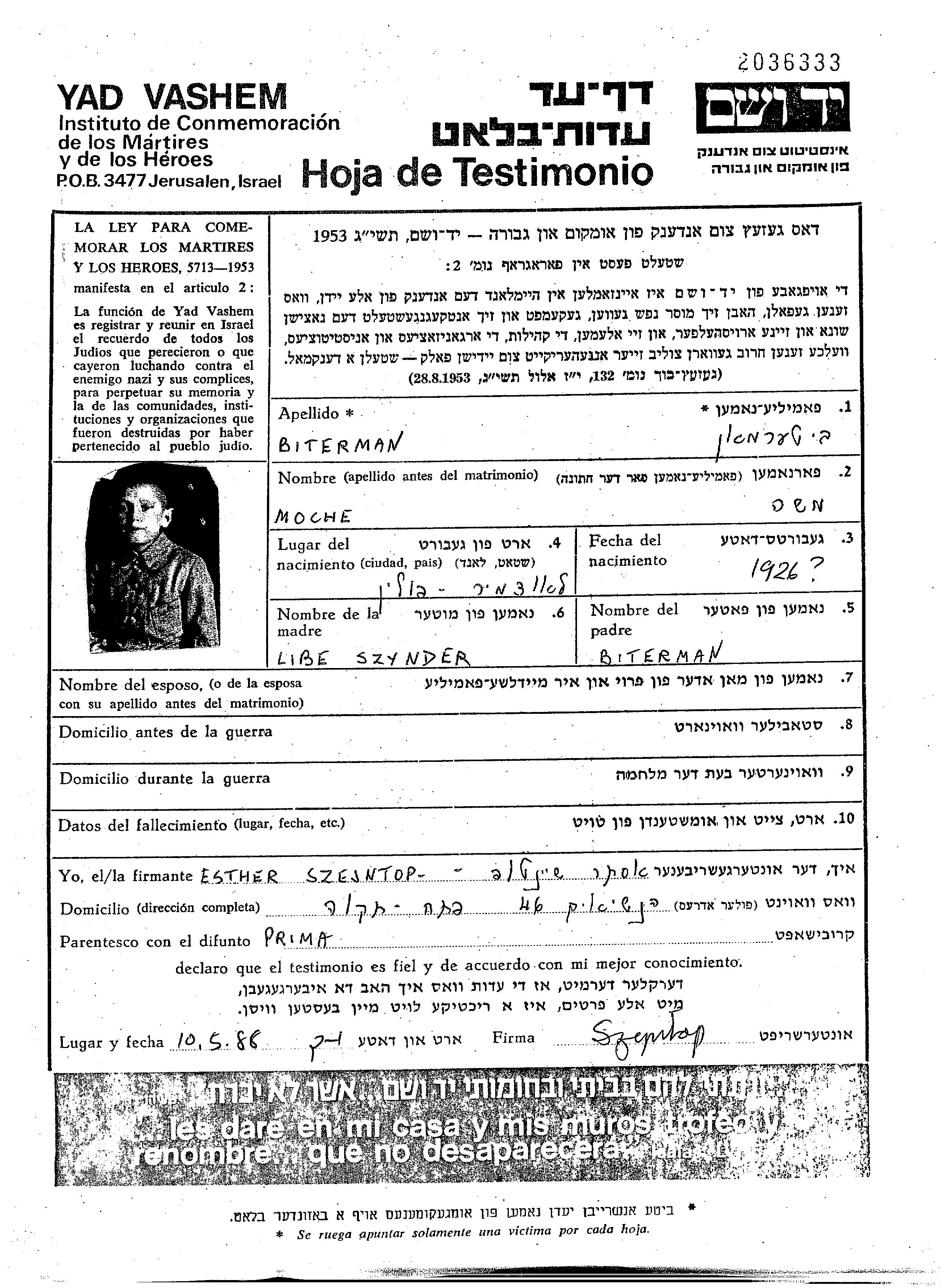 Moche Byterman est né à Lodmer, Pologne en 1926, fils de Liba née Szynder. Il était Enfant. Avant la seconde guerre mondiale il vivait à Lodmer, Pologne.
