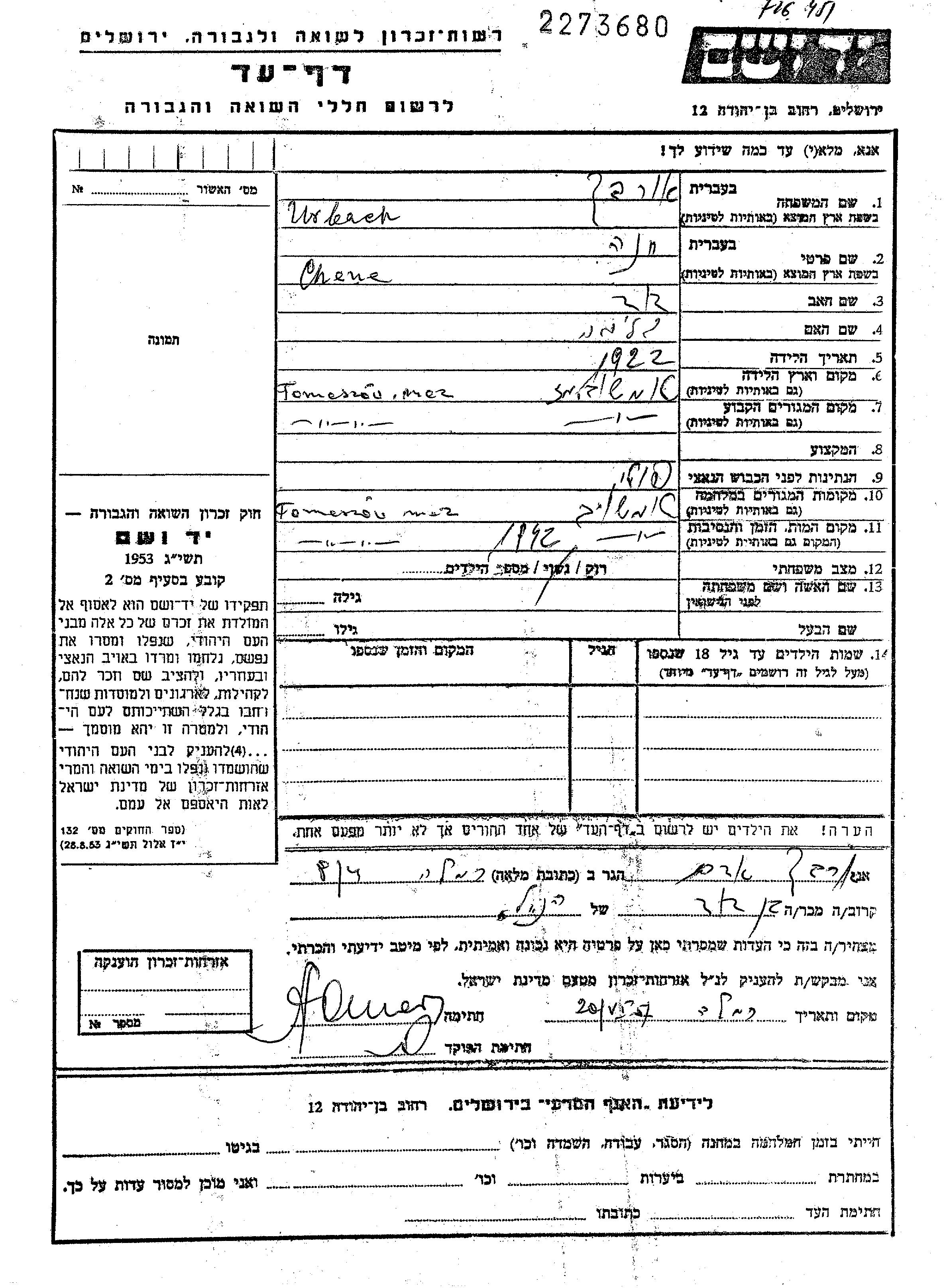 Urbakh Chana 1922 Tomaszow Mazowieckie, Pologne Feuille de témoignage