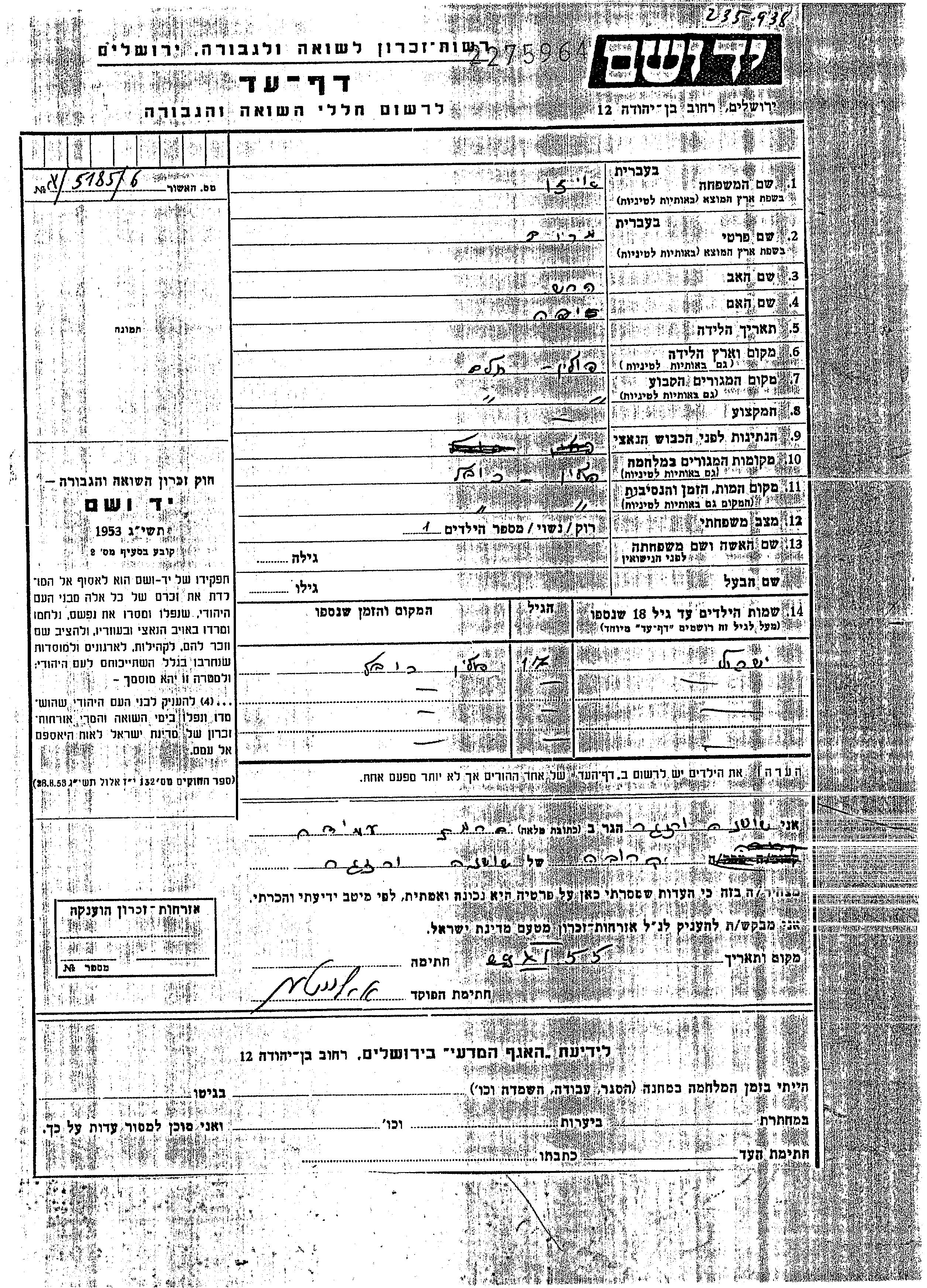 Yad Vashem - Pages of Testimony Names Memorial Collection