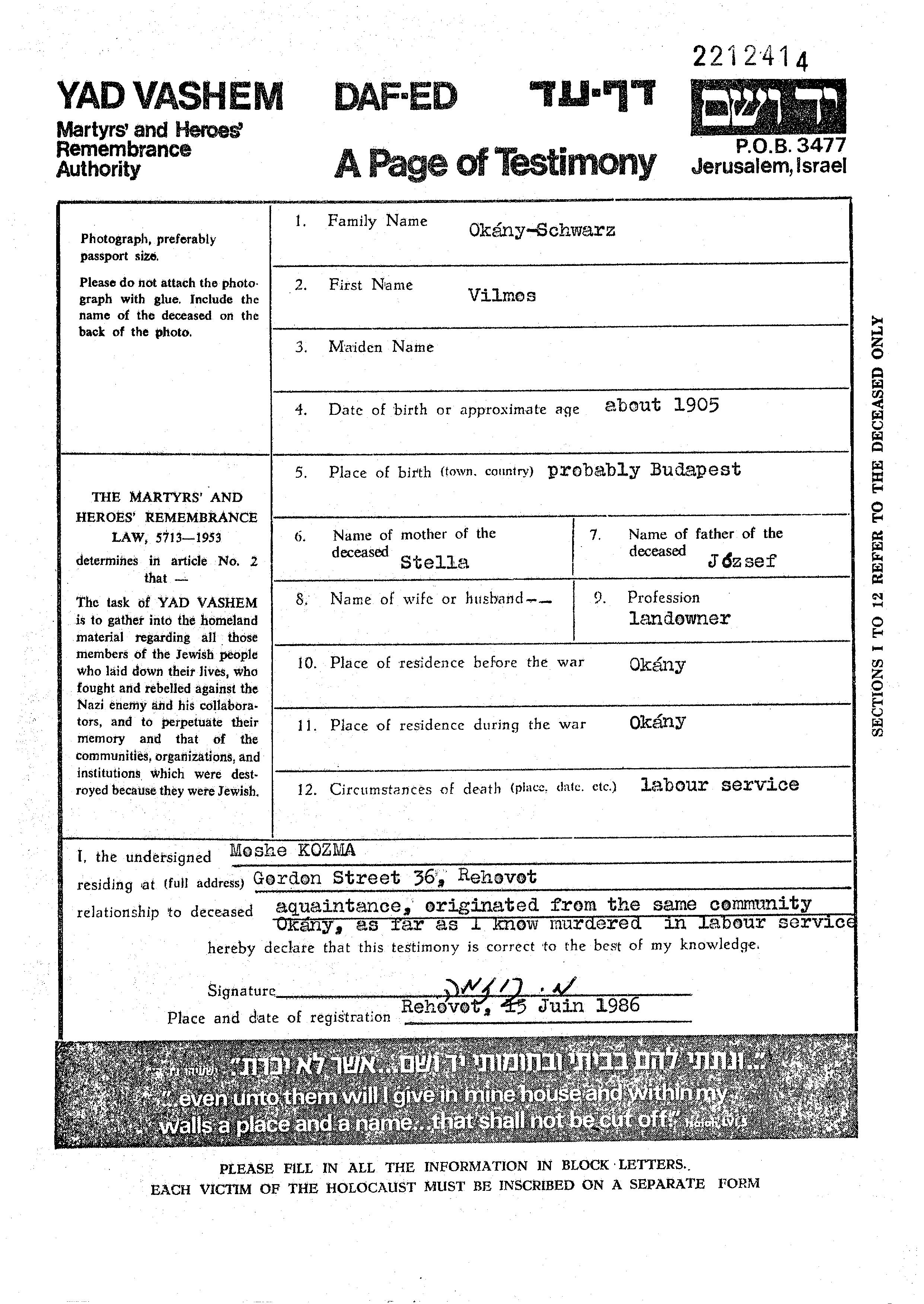 Vilmosh Schwarz Okany Okani est né à Budapest, Hongrie en 1905, fils de Jozsef et de Stella. Il était Propriétaire foncier. Avant la seconde guerre mondiale il vivait à Okany, Hongrie. Au cours de la guerre, il était à Okany, Hongrie.