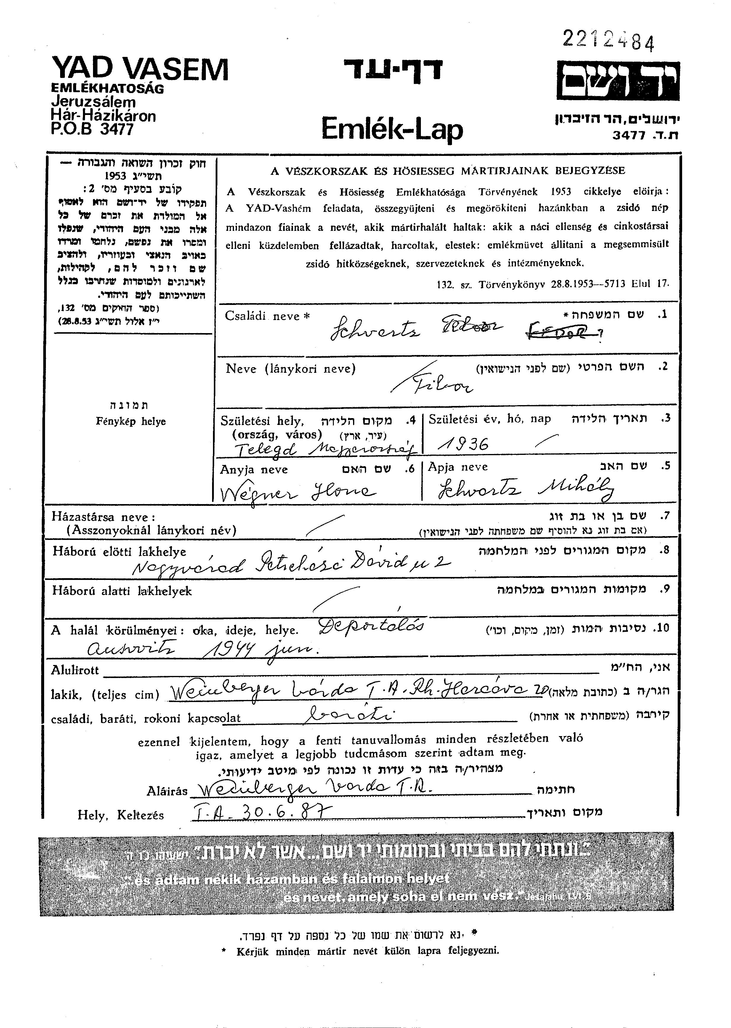Schvartz Tibor 1936 Nagyvarad, Roumanie Feuille de témoignage