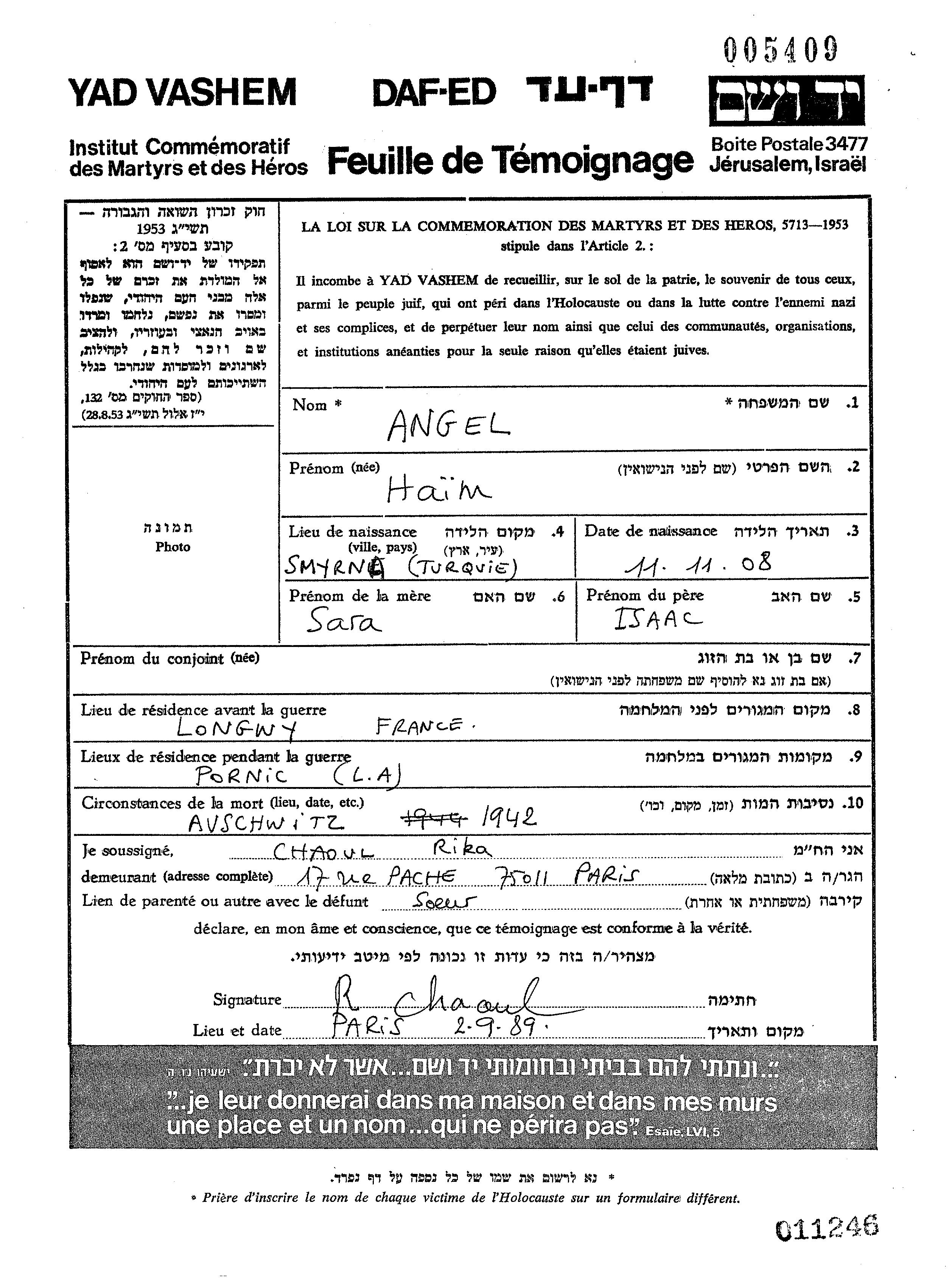 Haim Angel est né à Smyrna, Turquie en 1908, fils de Isaac et de Sara. Avant la seconde guerre mondiale il vivait à Longwy, France. Au cours de la guerre, il était à Pornic, France. Haim a été assassiné pendant la Shoah. Lieu de la mort: Auschwitz, Pologne en 1942.