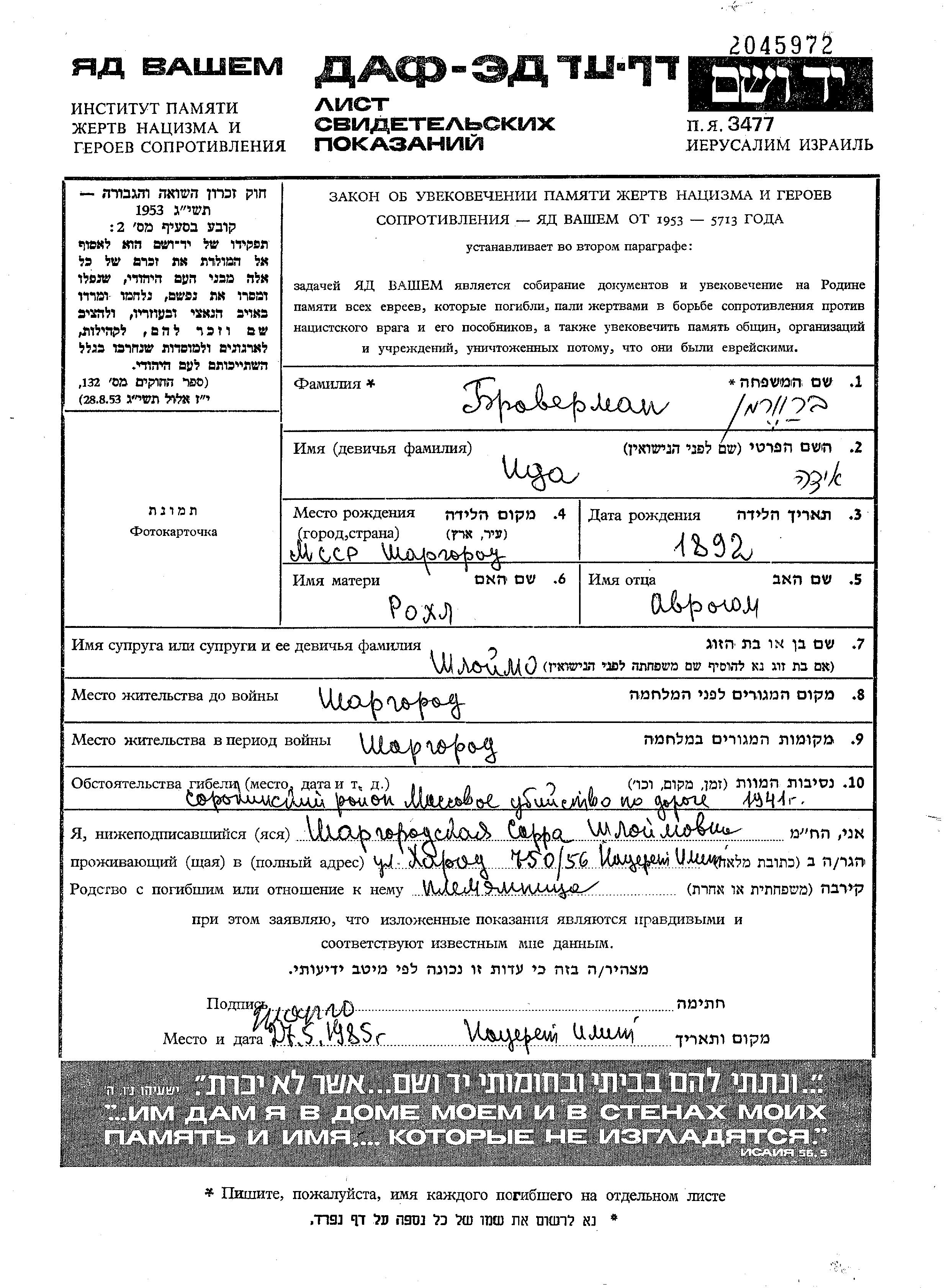 Braverman Ida 1892 Shargorod, Ukraine (URSS) Feuille de témoignage