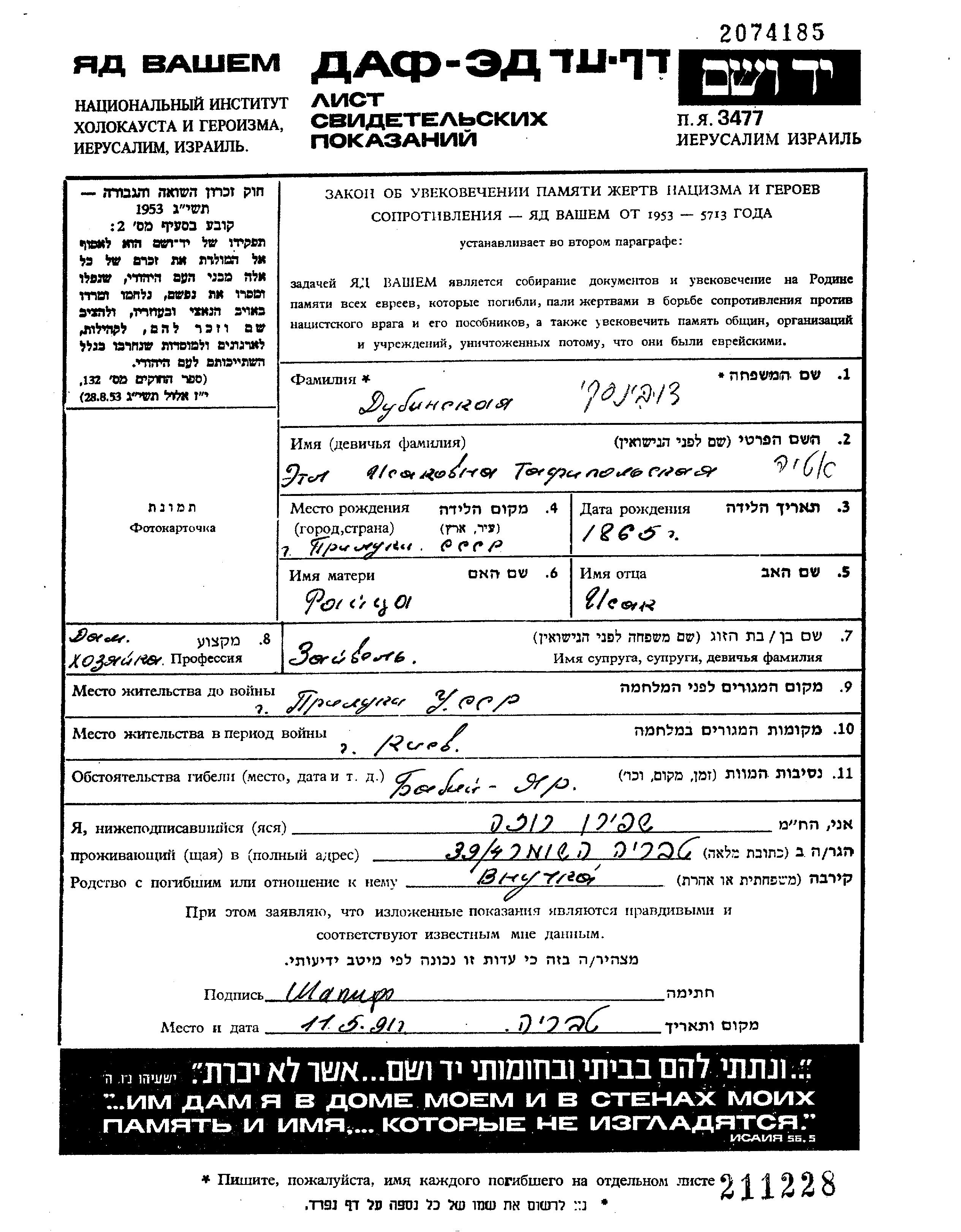Dubinski Etl 1865 Priluki, Ukraine (URSS) Feuille de témoignage