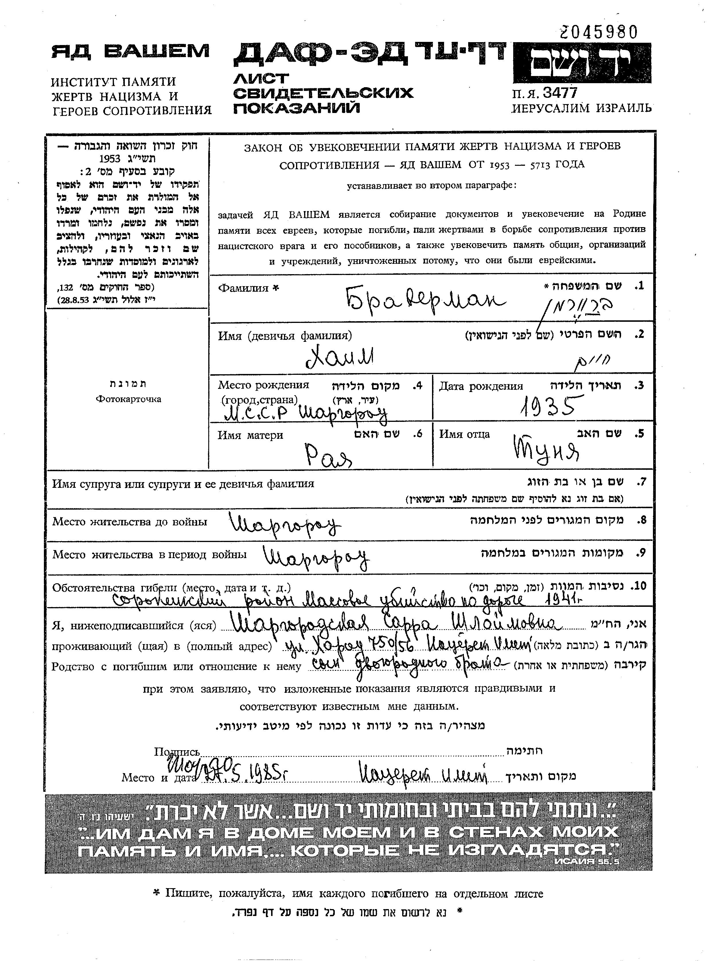 Braverman Khaim 1935 Shargorod, Ukraine (URSS) Feuille de témoignage