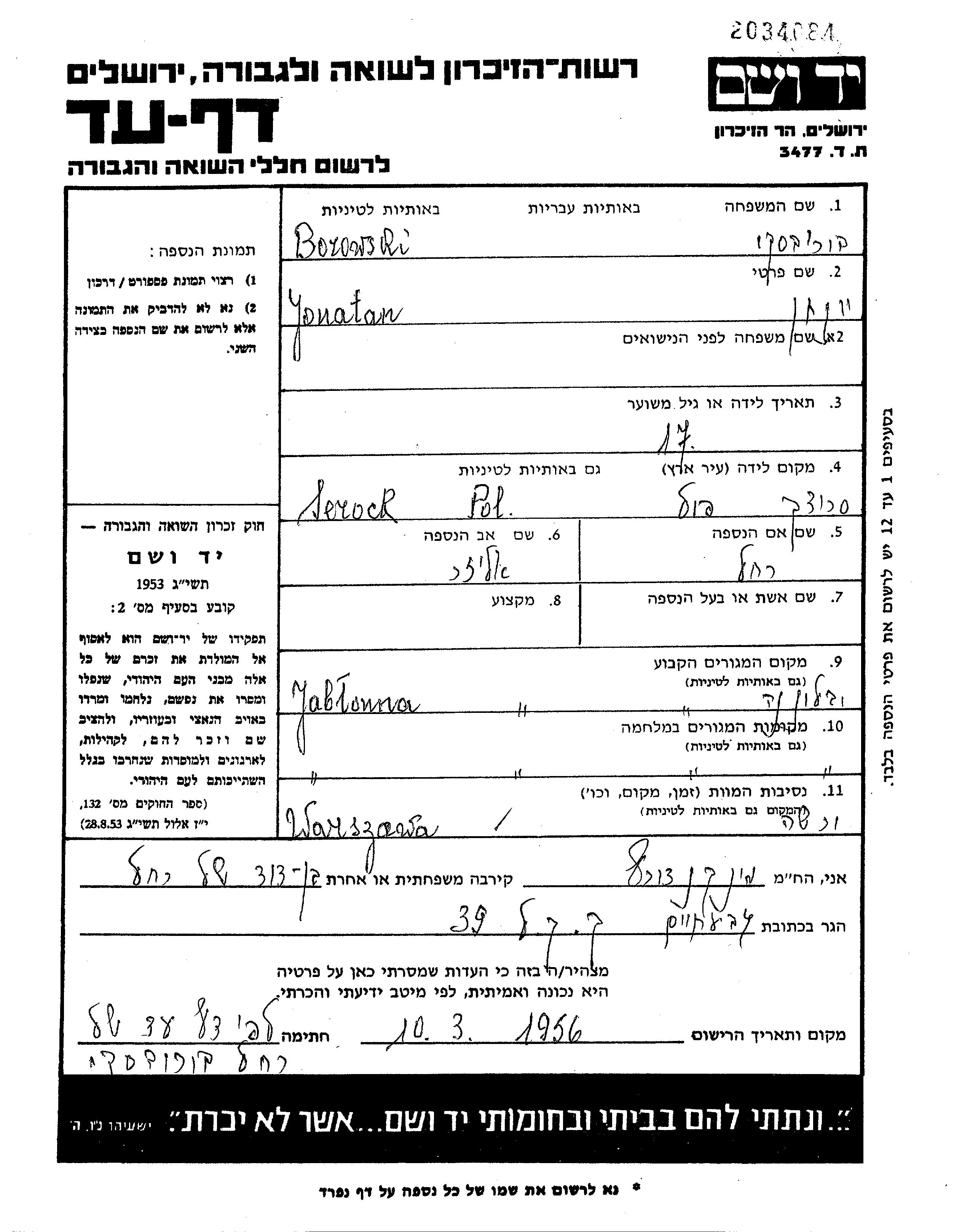 Borowski Jonatan Jablonna, Pologne Feuille de témoignage