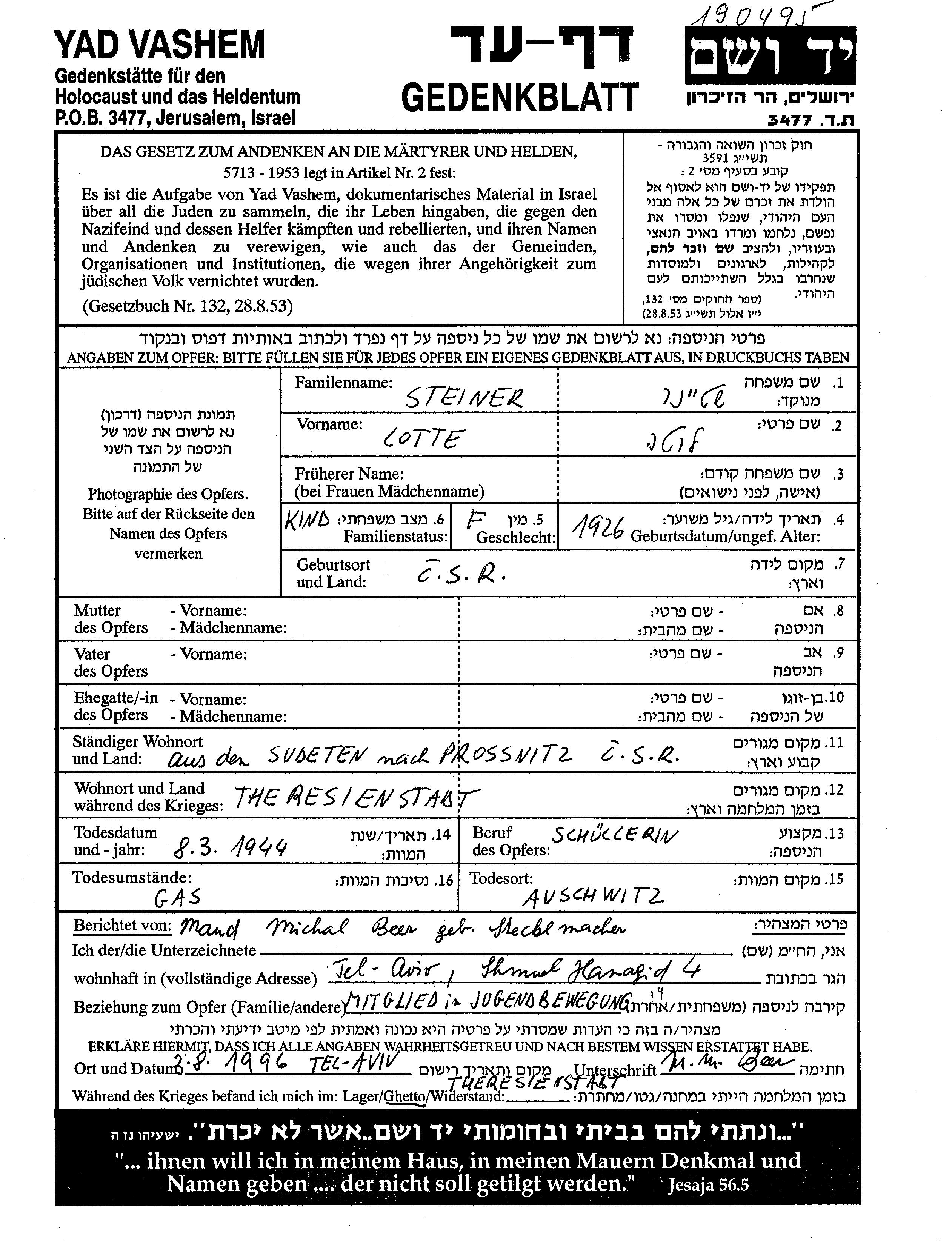Lota Steiner est née à Tchécoslovaquie en 1926. Elle était Élève. Avant la seconde guerre mondiale elle vivait à Prossnitz, Tchécoslovaquie. Pendant la guerre, elle était à Prossnitz, Tchécoslovaquie.