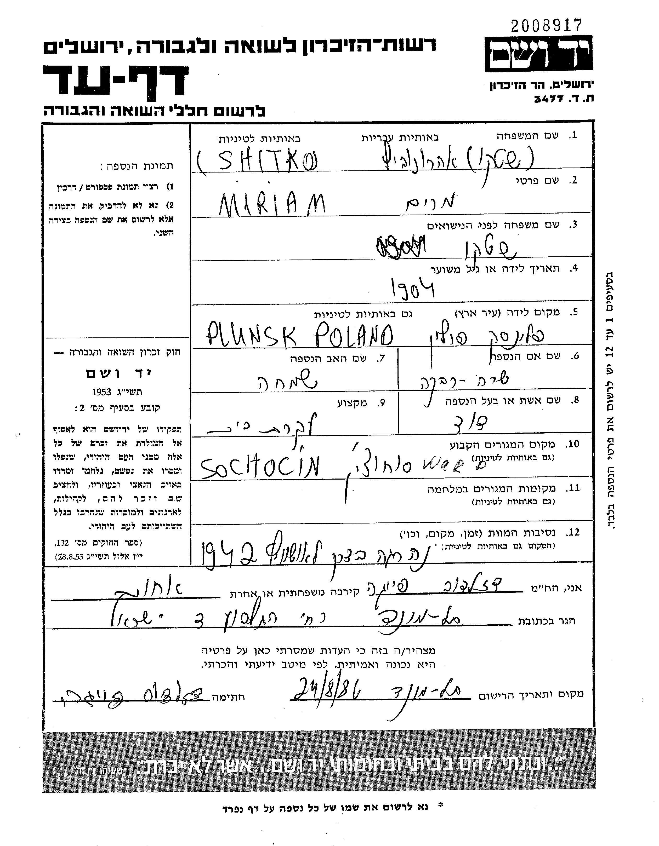 Aronovich Miriam 1904 Sochocin, Pologne Feuille de témoignage