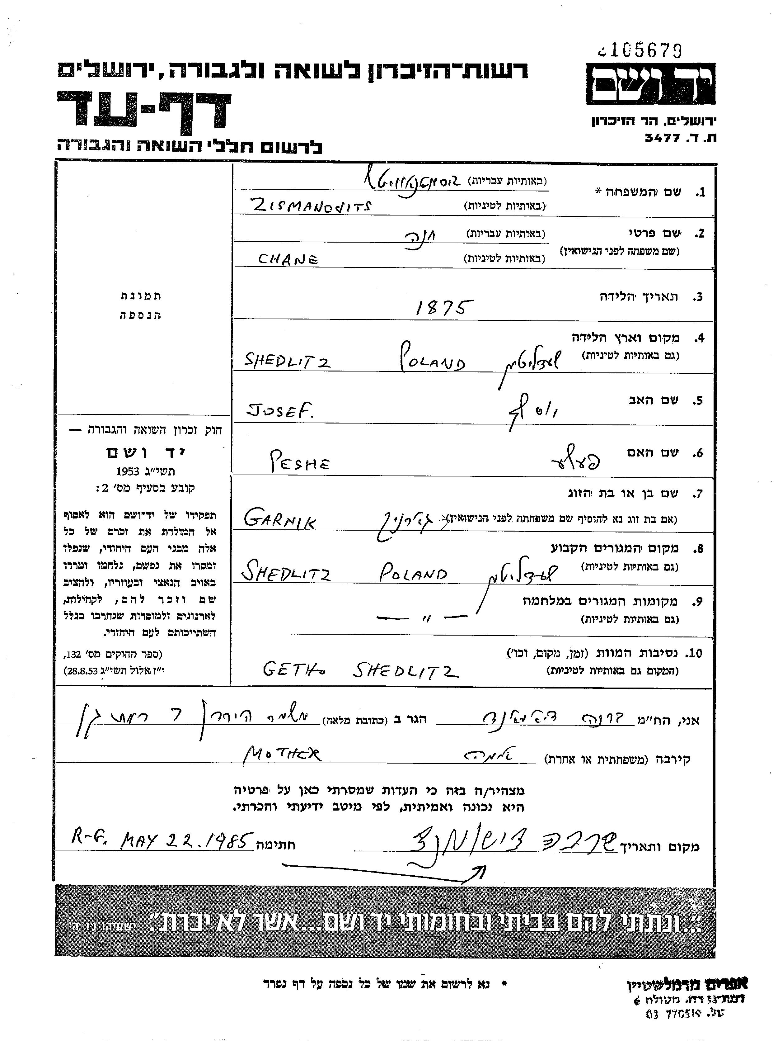 Chane Zismanovits née Granik est née à Shedlitz, Pologne en 1875, fille de Josef et de Peshe. Elle était Mariée à Bezalel. Avant la seconde guerre mondiale elle vivait à Shedlitz, Pologne. Pendant la guerre, elle était à Shedlitz, Pologne.