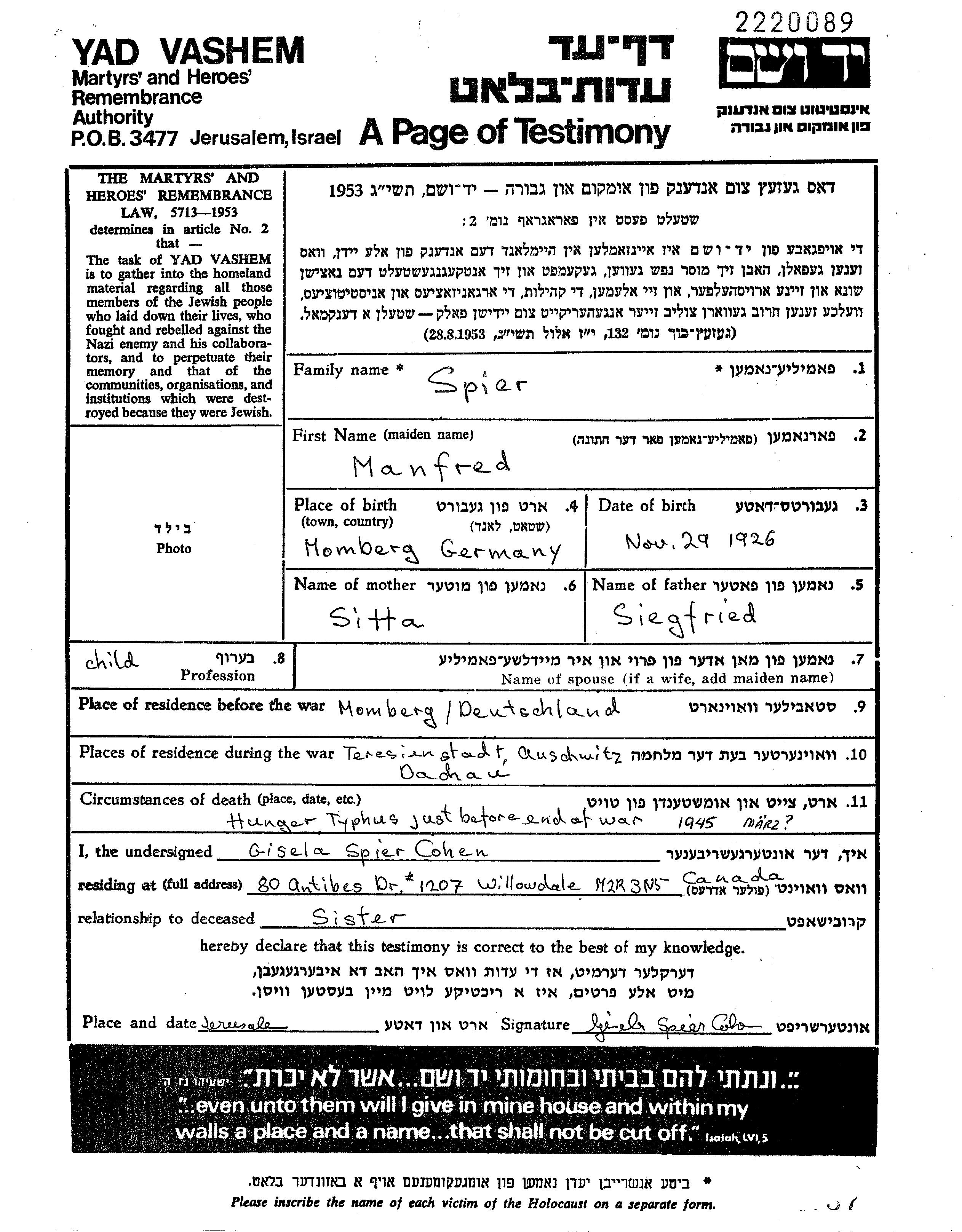 Spier Shafir Manfred 1926 Momberg, Allemagne Feuille de témoignage