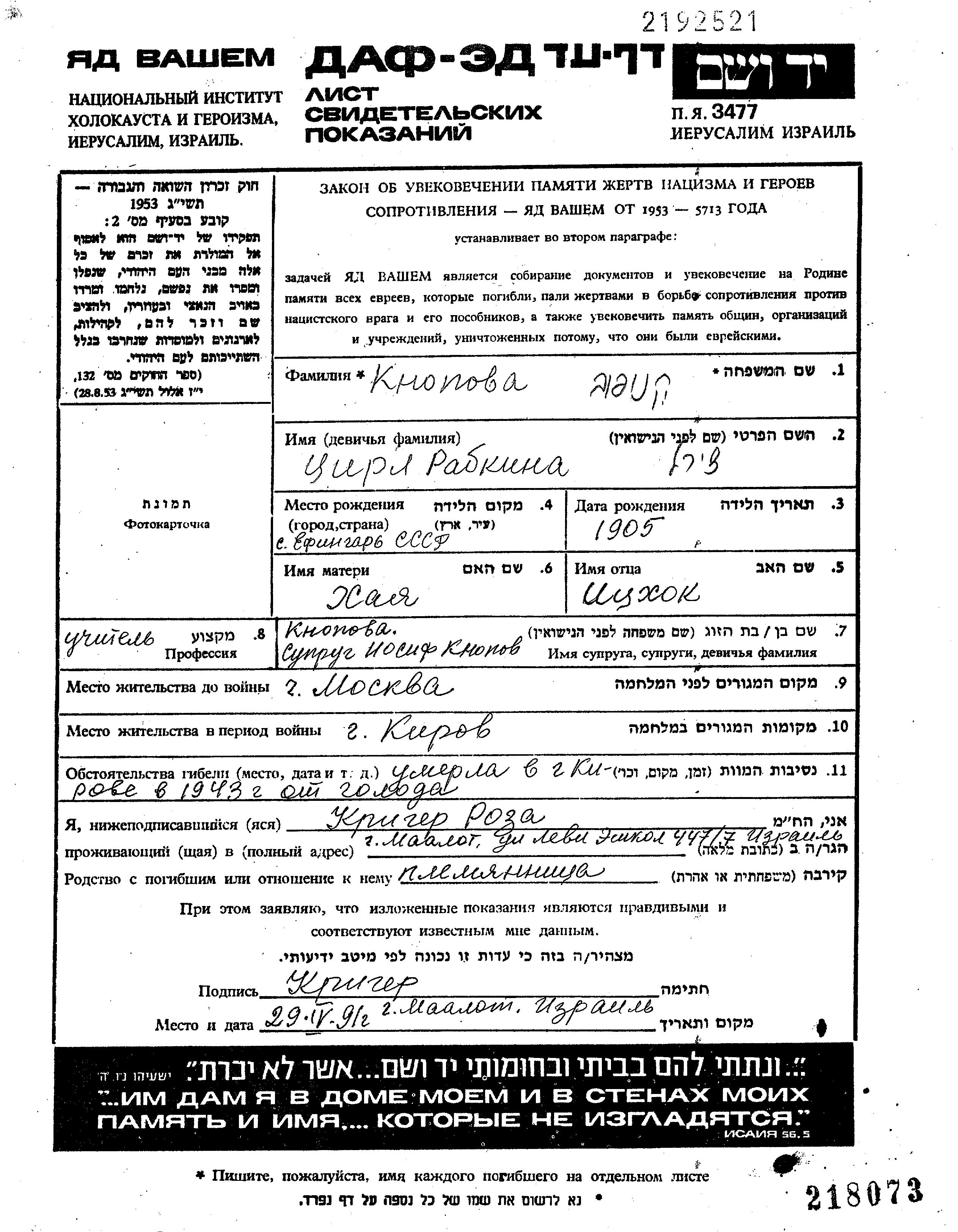 Cirl Knopov est née à Russie (URSS) en 1905, fille de Itzak et de Khaja Khai. Elle était Mariée à Josif. Avant la seconde guerre mondiale elle vivait à Moskva, Russie (URSS). Pendant la guerre, elle était à Kirov, Russie (URSS).