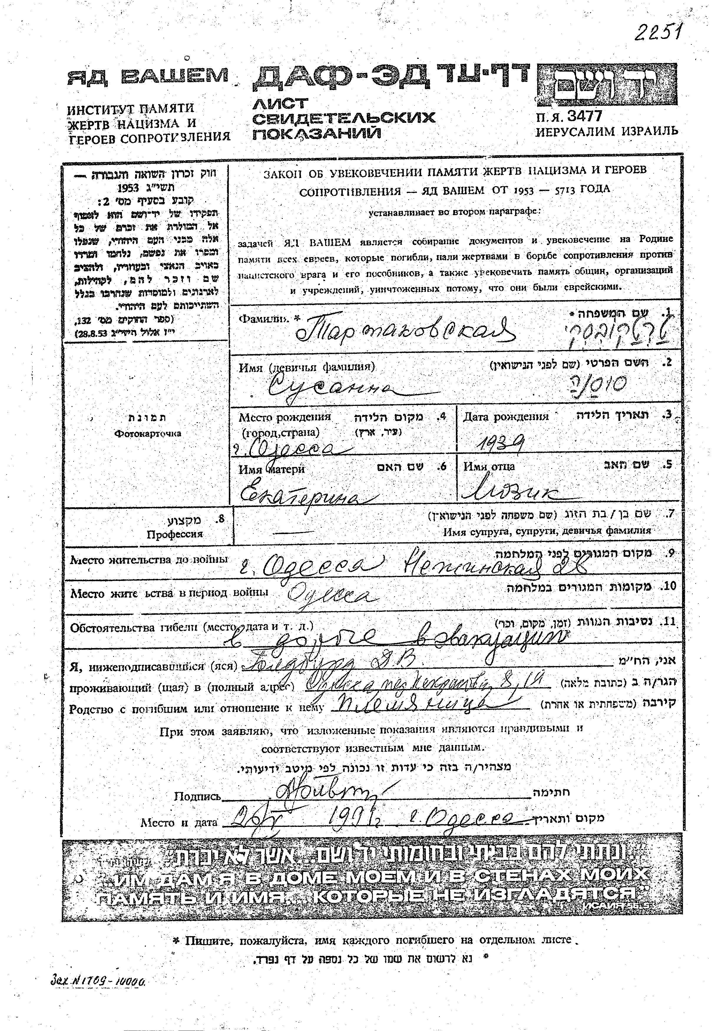 Tartakovsky Susana 1939 Odessa, Ukraine (URSS) Feuille de témoignage