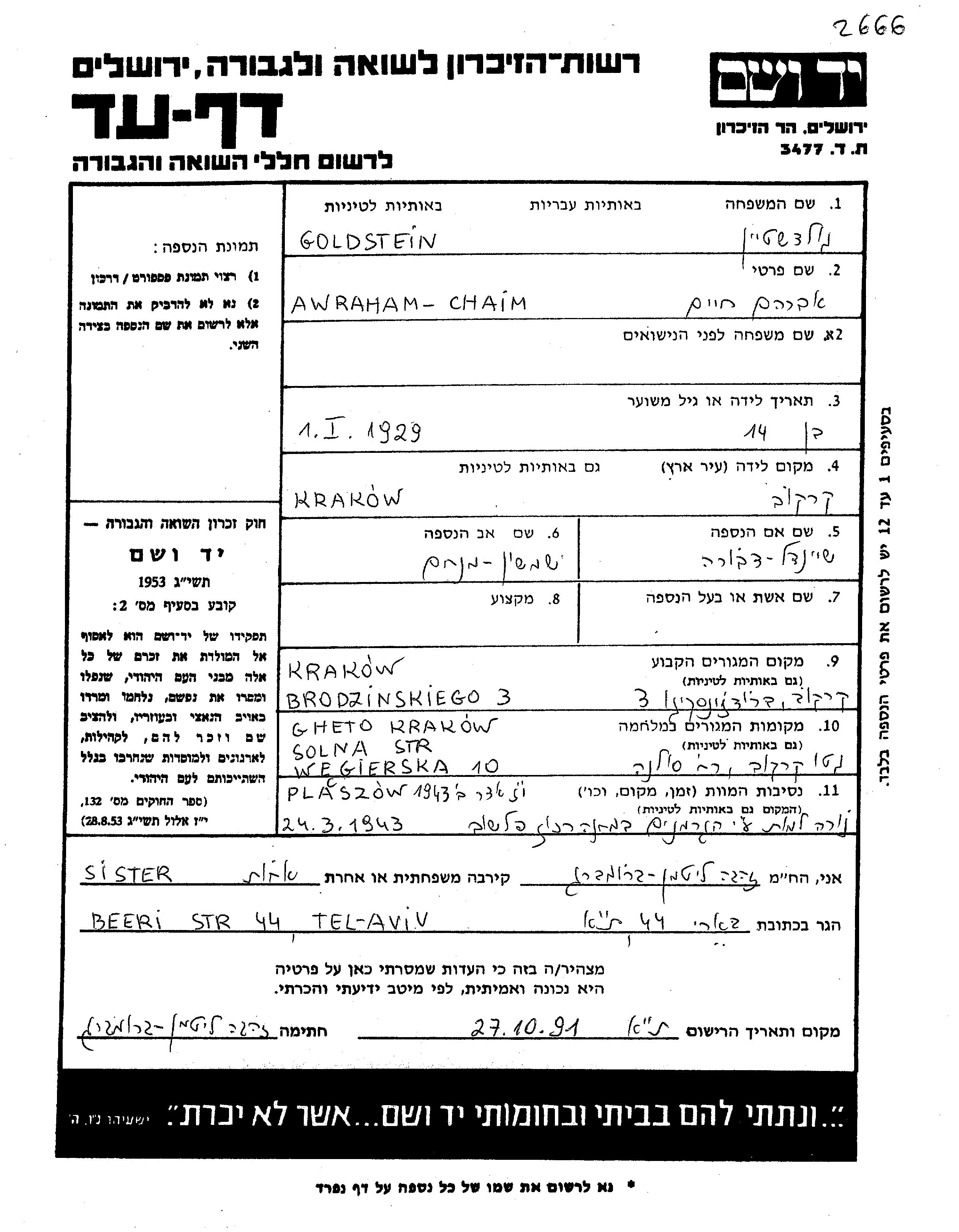 Goldstein Awraham Chaim 1929 Krakow, Pologne Feuille de témoignage