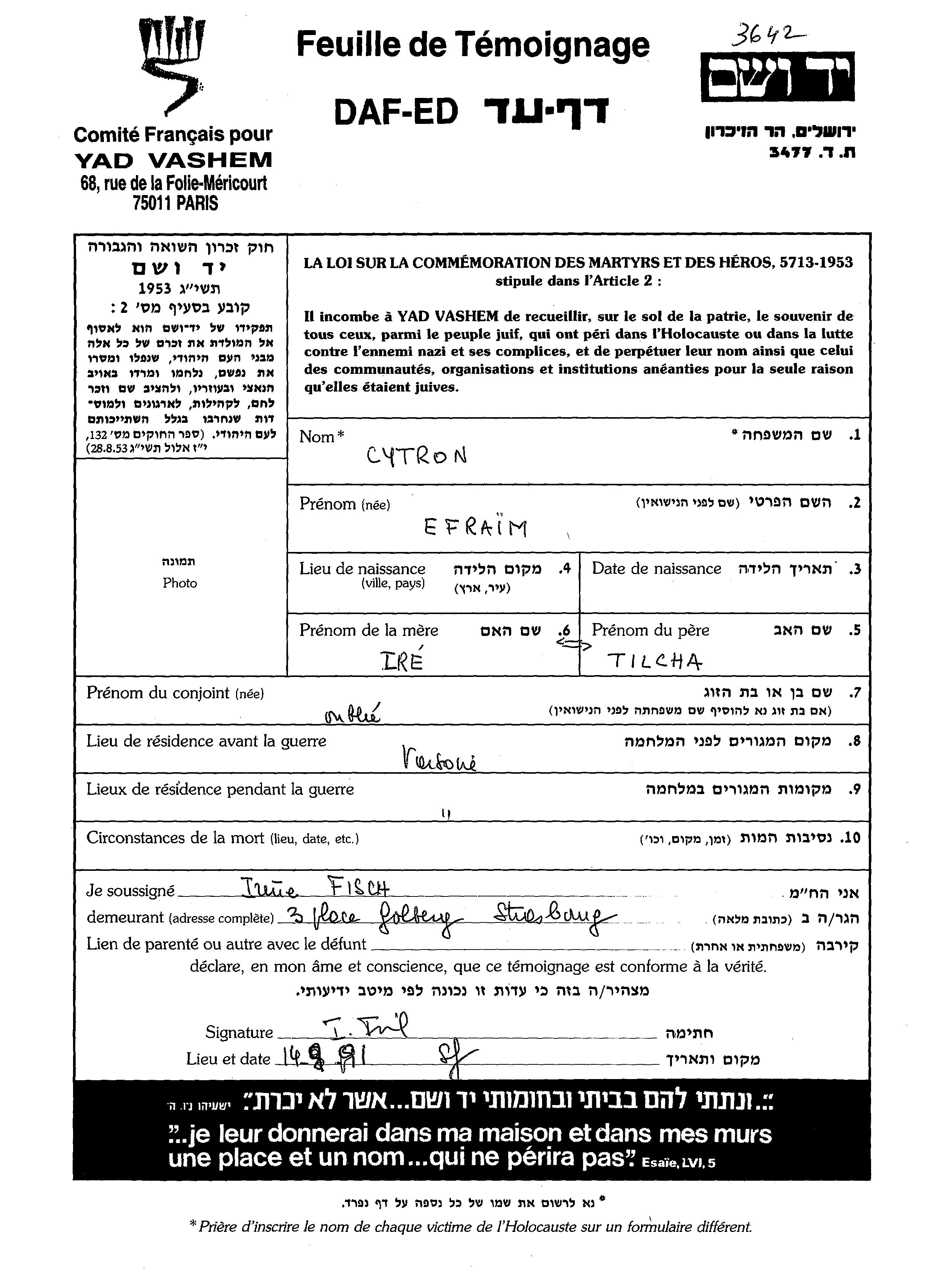 Cytron Ephraim Warszawa, Pologne Feuille de témoignage