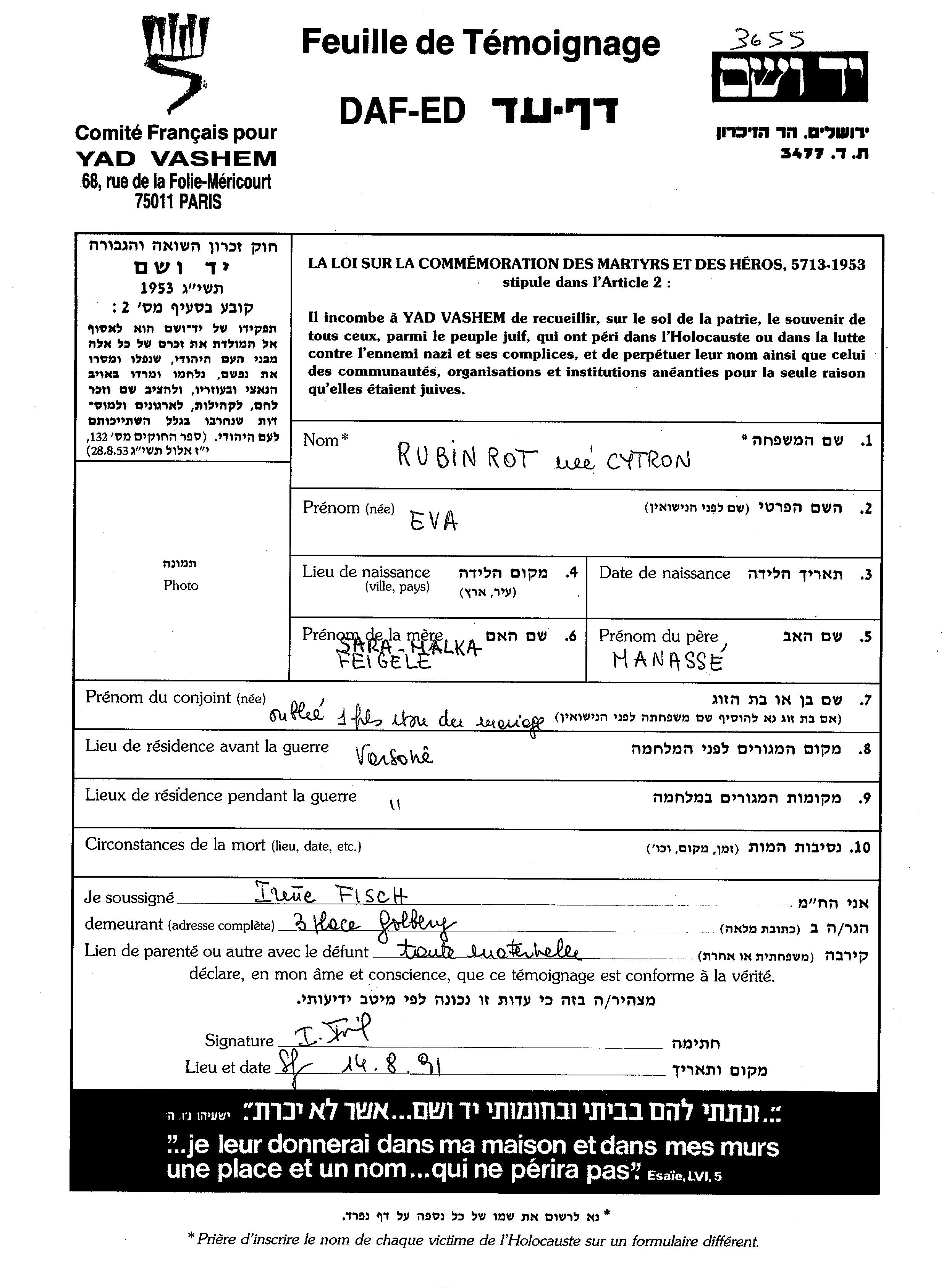Rubinrot Eva Warszawa, Pologne Feuille de témoignage
