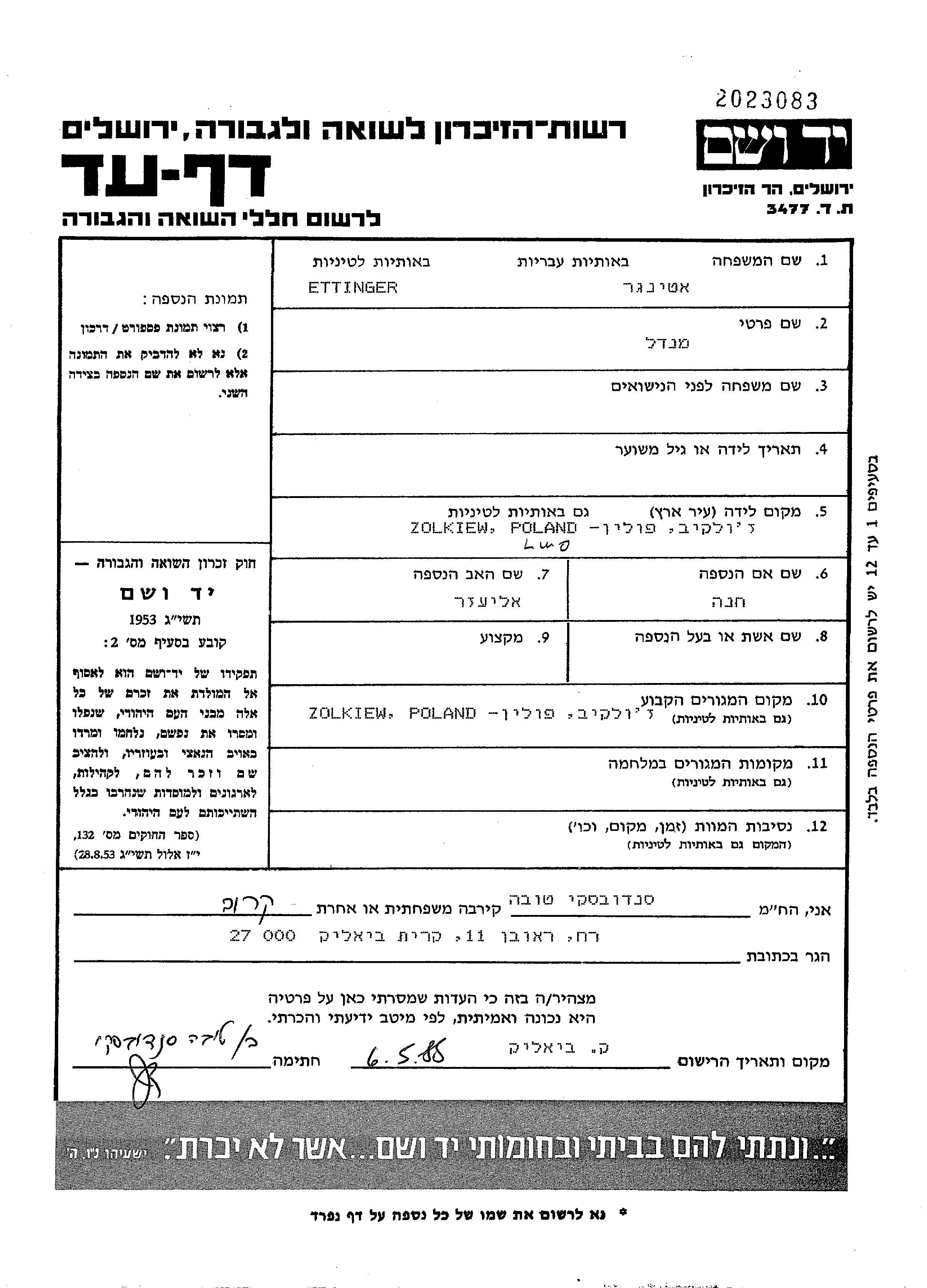 Ettinger Mendel Zolkiew, Pologne Feuille de témoignage