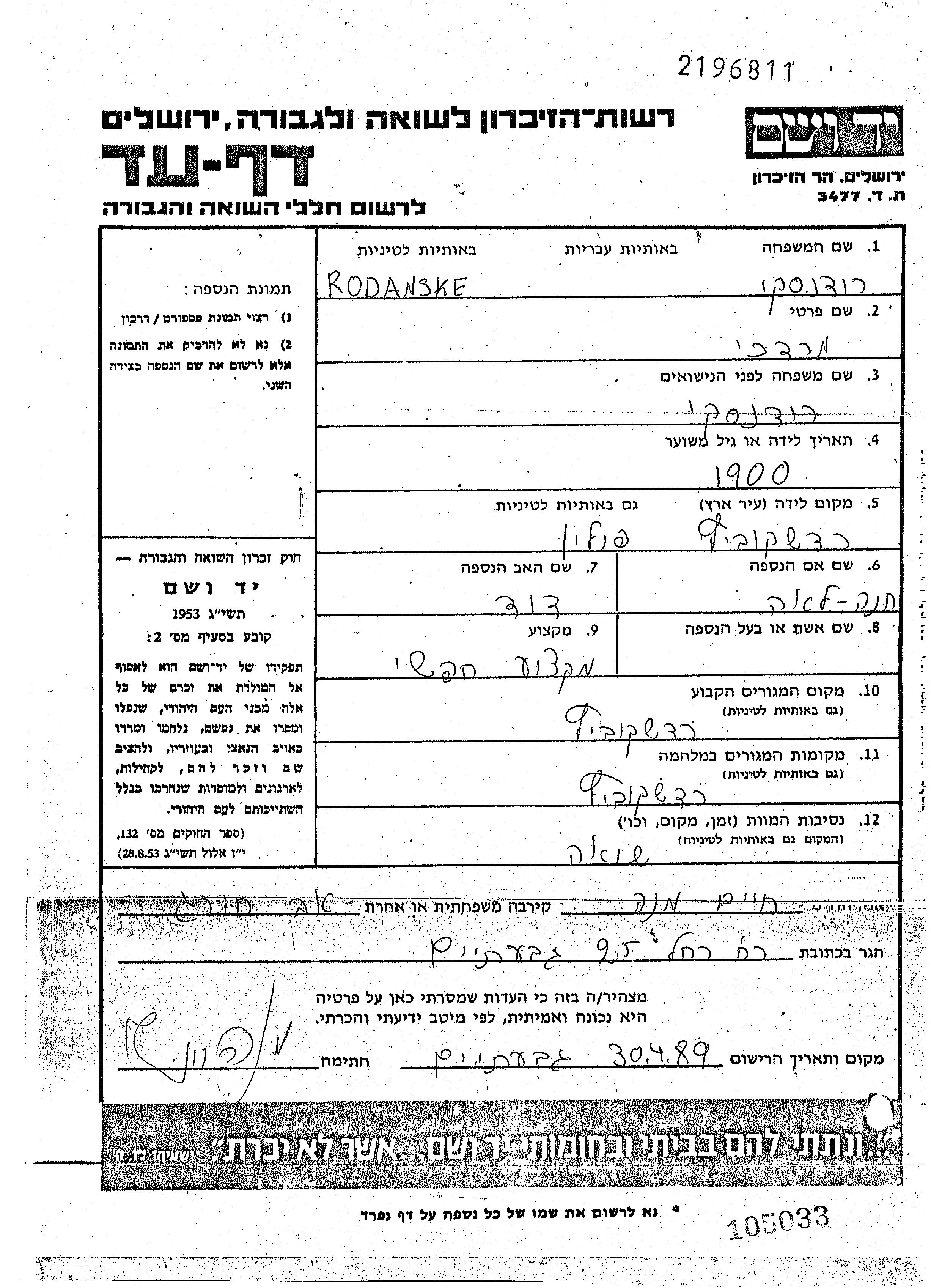 Rodanske Mordekhai 1900 Radoszkowicze, Pologne Feuille de témoignage