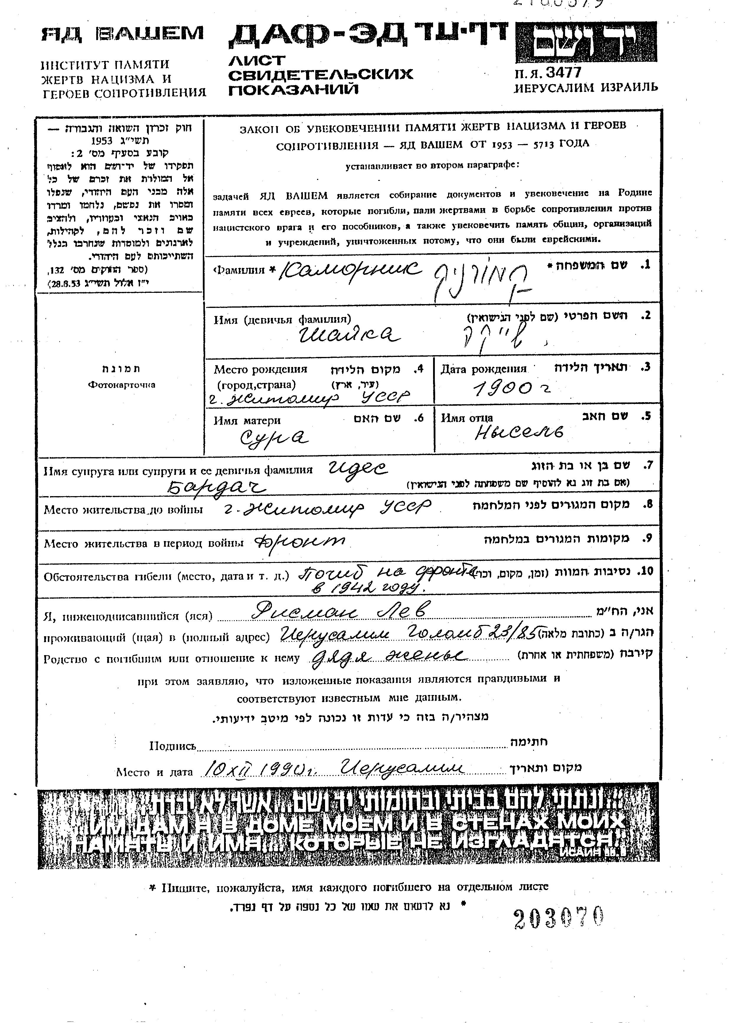 Shaika Kamornik est né à Zhitomir, Ukraine (URSS) en 1900, fils de Nysel et de Sura. Il était Mariée à Ides née Bardach. Avant la seconde guerre mondiale il vivait à Zhitomir, Ukraine (URSS). Au cours de la guerre, il était à the Soviet armed forces. Shaika a été tué en tant que militaire pendant la Seconde Guerre mondiale. Lieu de la mort: the Soviet armed forces en 1942.