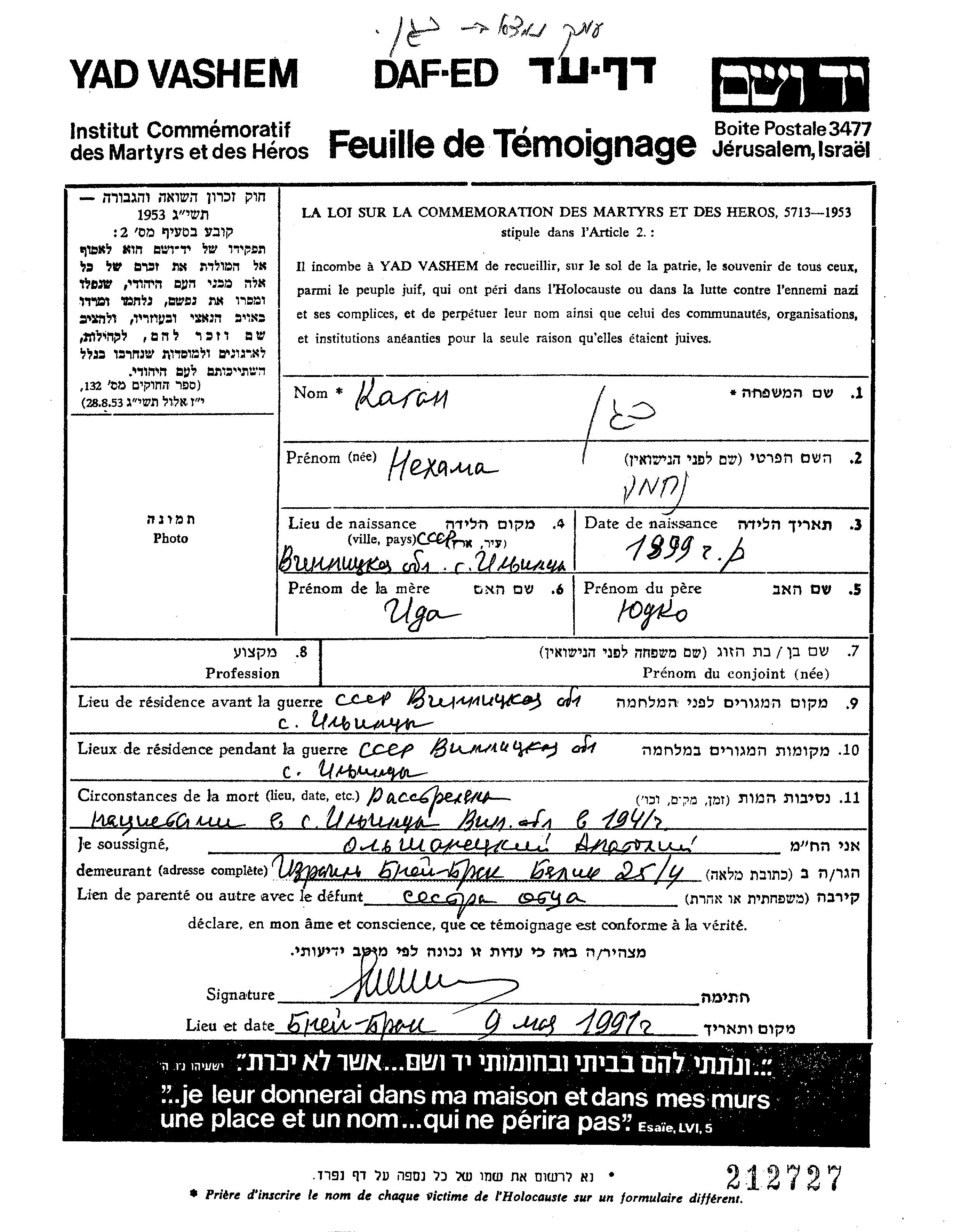 Kagan Nekhama 1899 Ilintsy, Ukraine (URSS) Feuille de témoignage