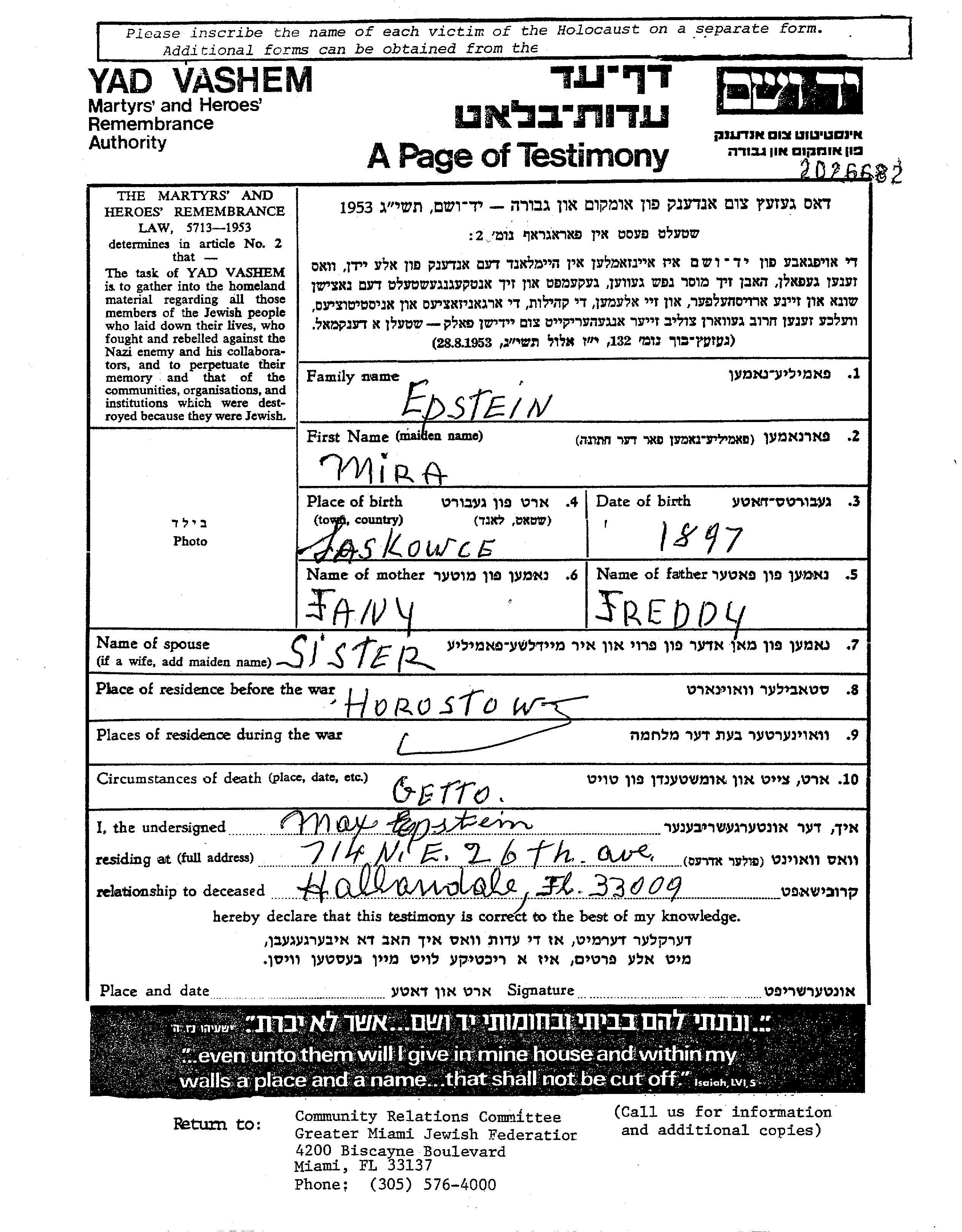 Mira Epstein est née à Laskowce, Pologne en 1897, fille de Freddy et de Fani. Avant la seconde guerre mondiale elle vivait à Chorostow, Pologne. Pendant la guerre, elle était à Chorostow, Pologne.