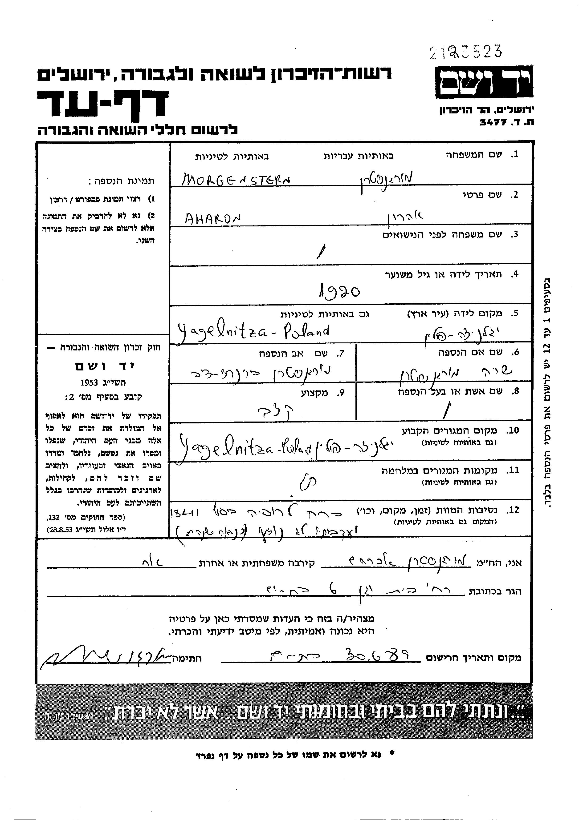 Morgenstern Aharon 1920 Jagielnica, Pologne Feuille de témoignage