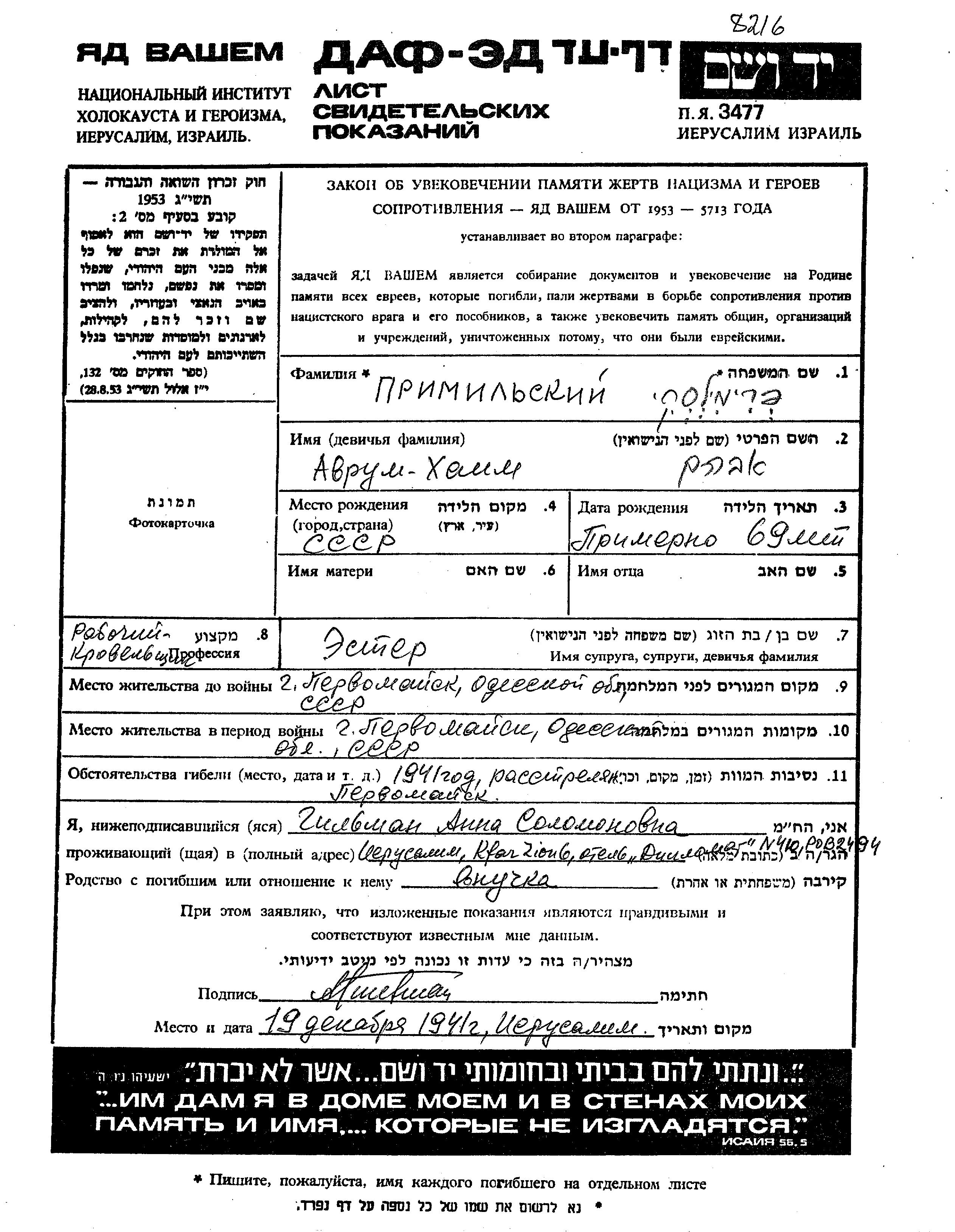 Primilski Avrum Khaim Pervomaysk, Ukraine (URSS) Feuille de témoignage