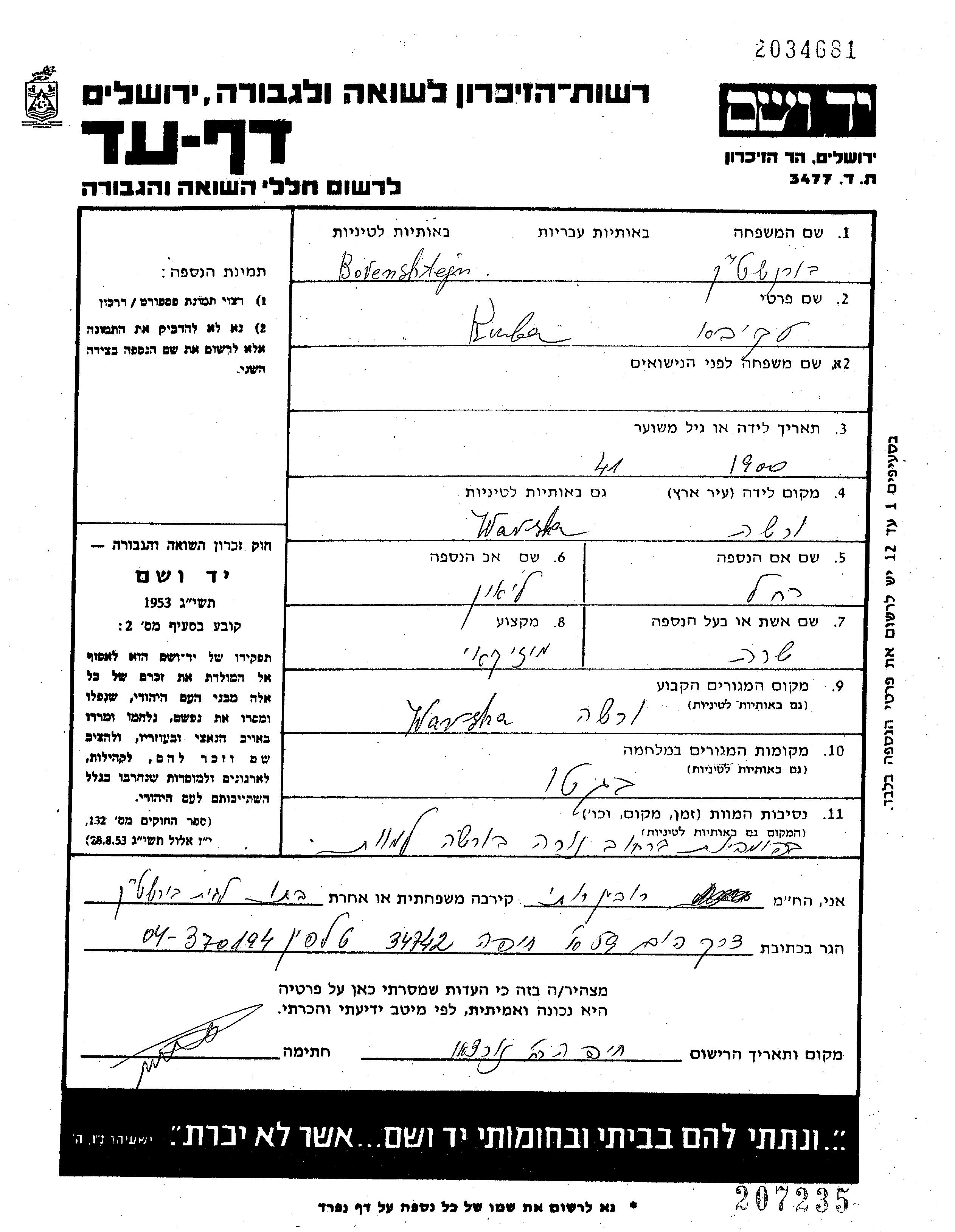 Borenshtejn Kuba Akiva 1900 Warszawa, Pologne Feuille de témoignage