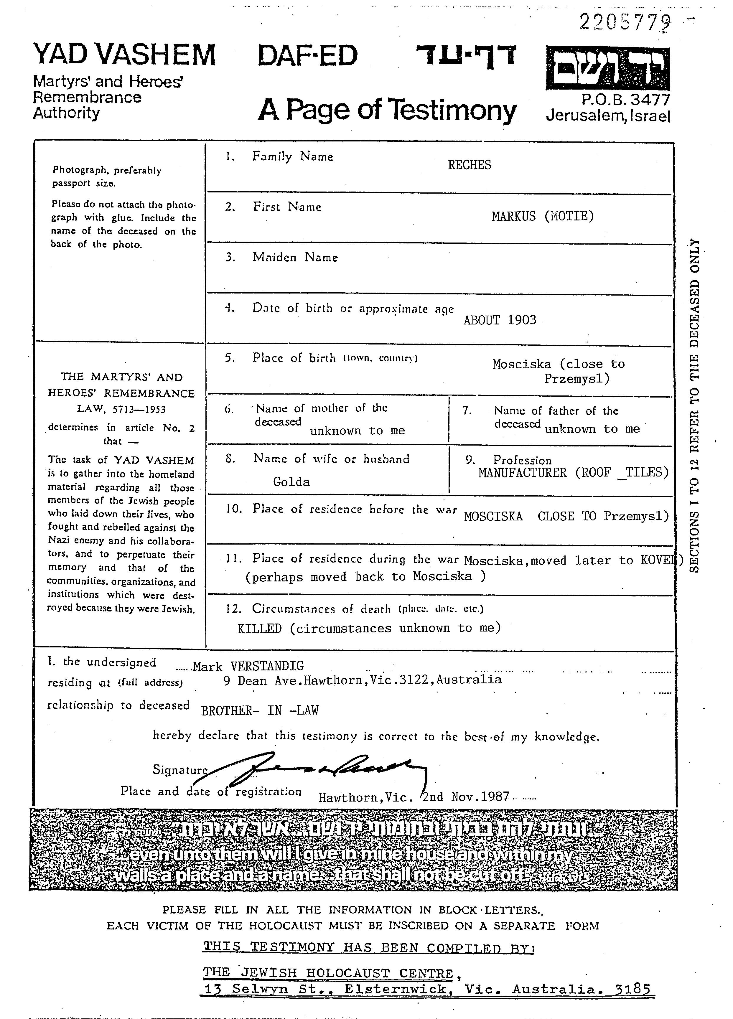 Motie Markus Reches est né à Mosciska, Pologne en 1903. Il était Industriel et Mariée à Golda. Avant la seconde guerre mondiale il vivait à Mosciska, Pologne. Au cours de la guerre, il était à Mosciska, Pologne.