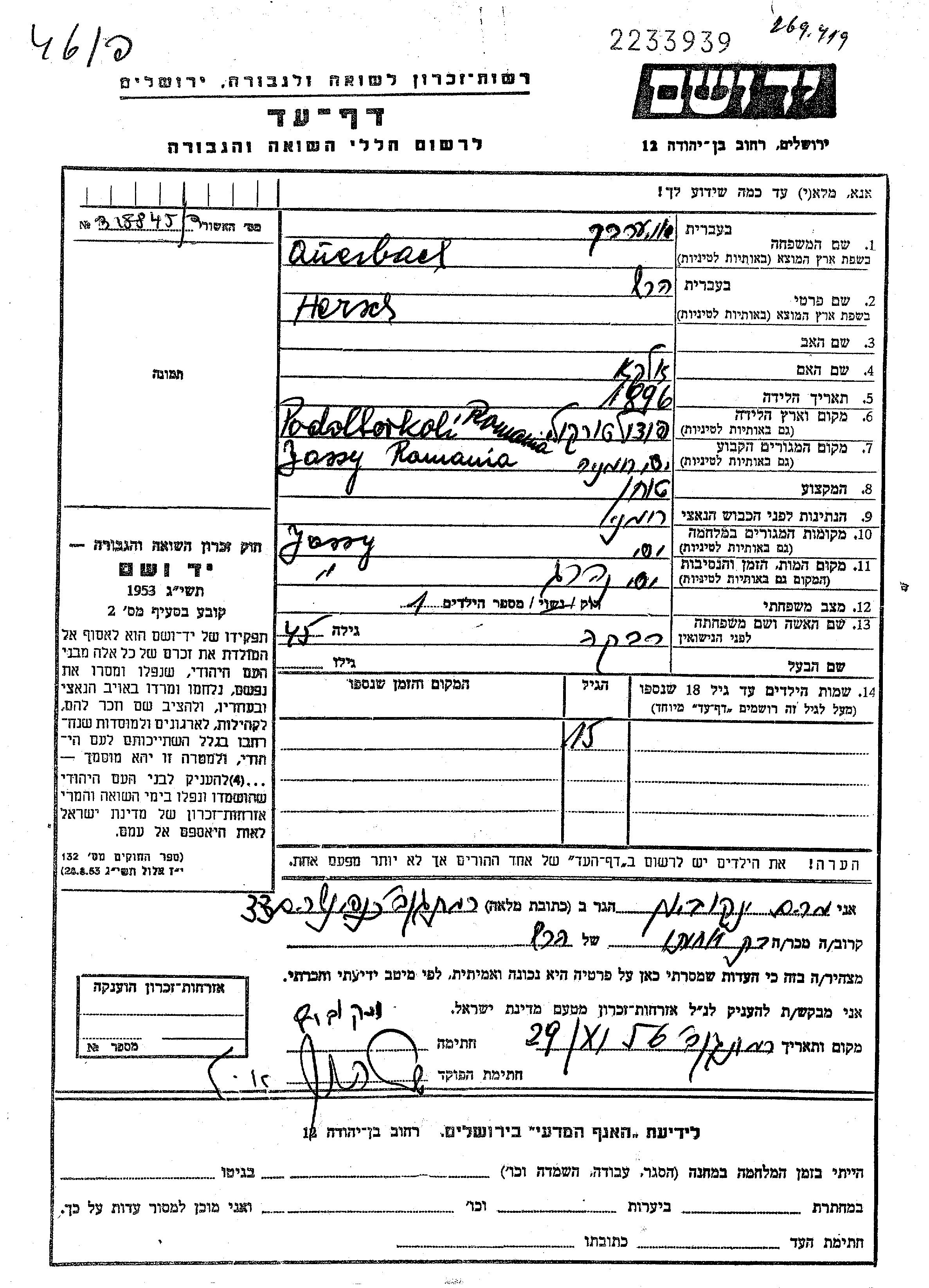 Hersh Auerbach est né à Podu Turcului, Roumanie en 1896, fils de Ela. Il était Meunier et Mariée à Rivka. Avant la seconde guerre mondiale il vivait à Jassy, Roumanie. Au cours de la guerre, il était à Jassy, Roumanie.