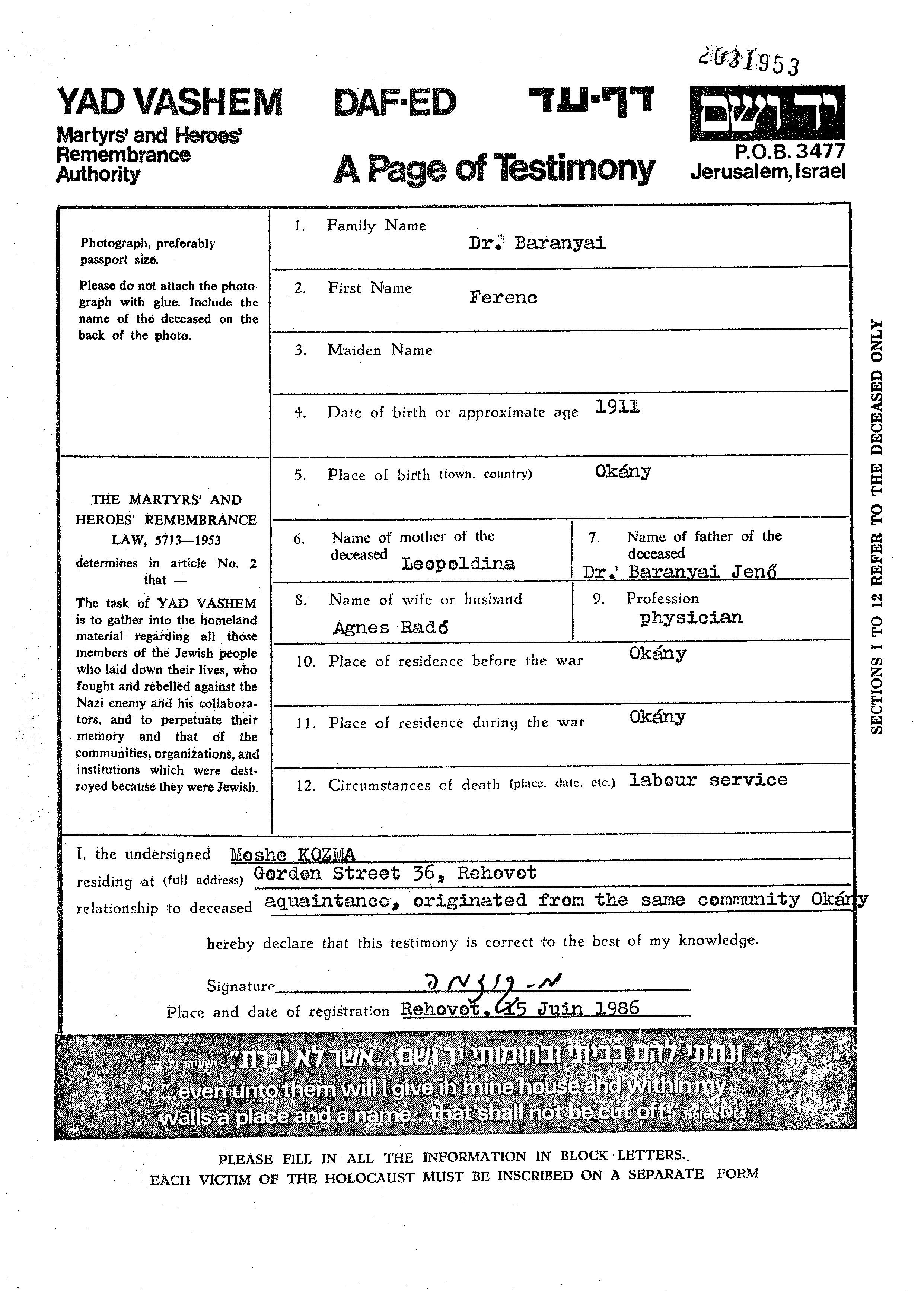 Ferentz Baranyai est né à Okany, Hongrie en 1911, fils de Jeno et de Leopoldina. Il était Médecin et Mariée à Agnesh. Avant la seconde guerre mondiale il vivait à Okany, Hongrie. Au cours de la guerre, il était à bataillons de travail forcé MUSZ dans les forces armées hongroises.