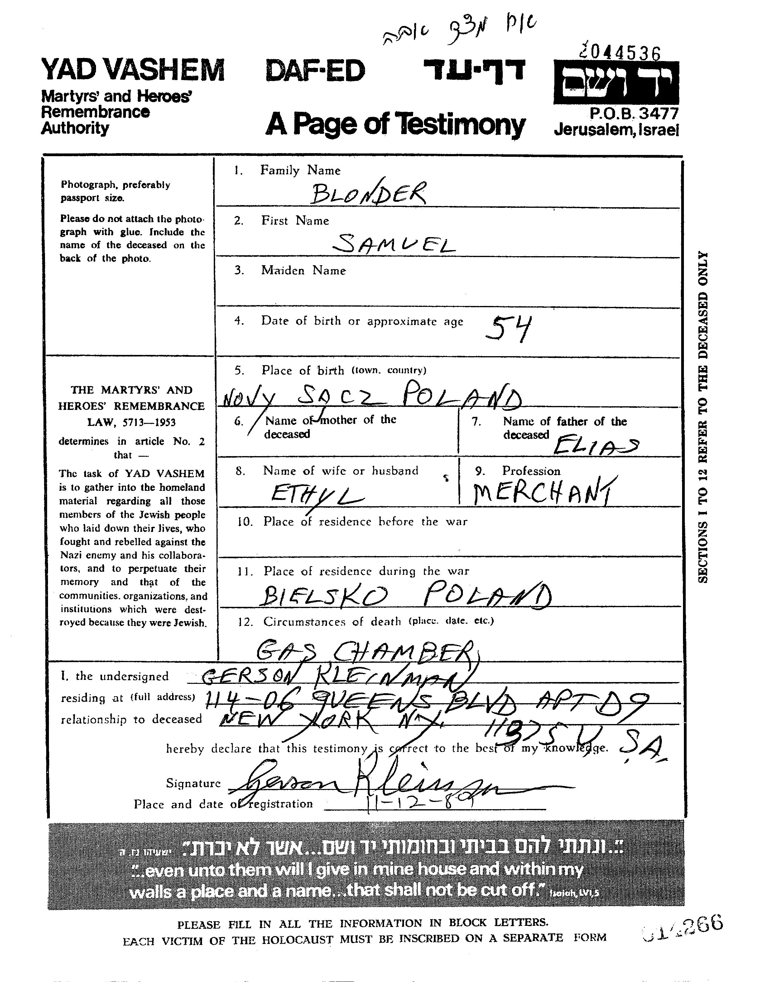 Blonder Shmuel endroit inconnu, Feuille de témoignage