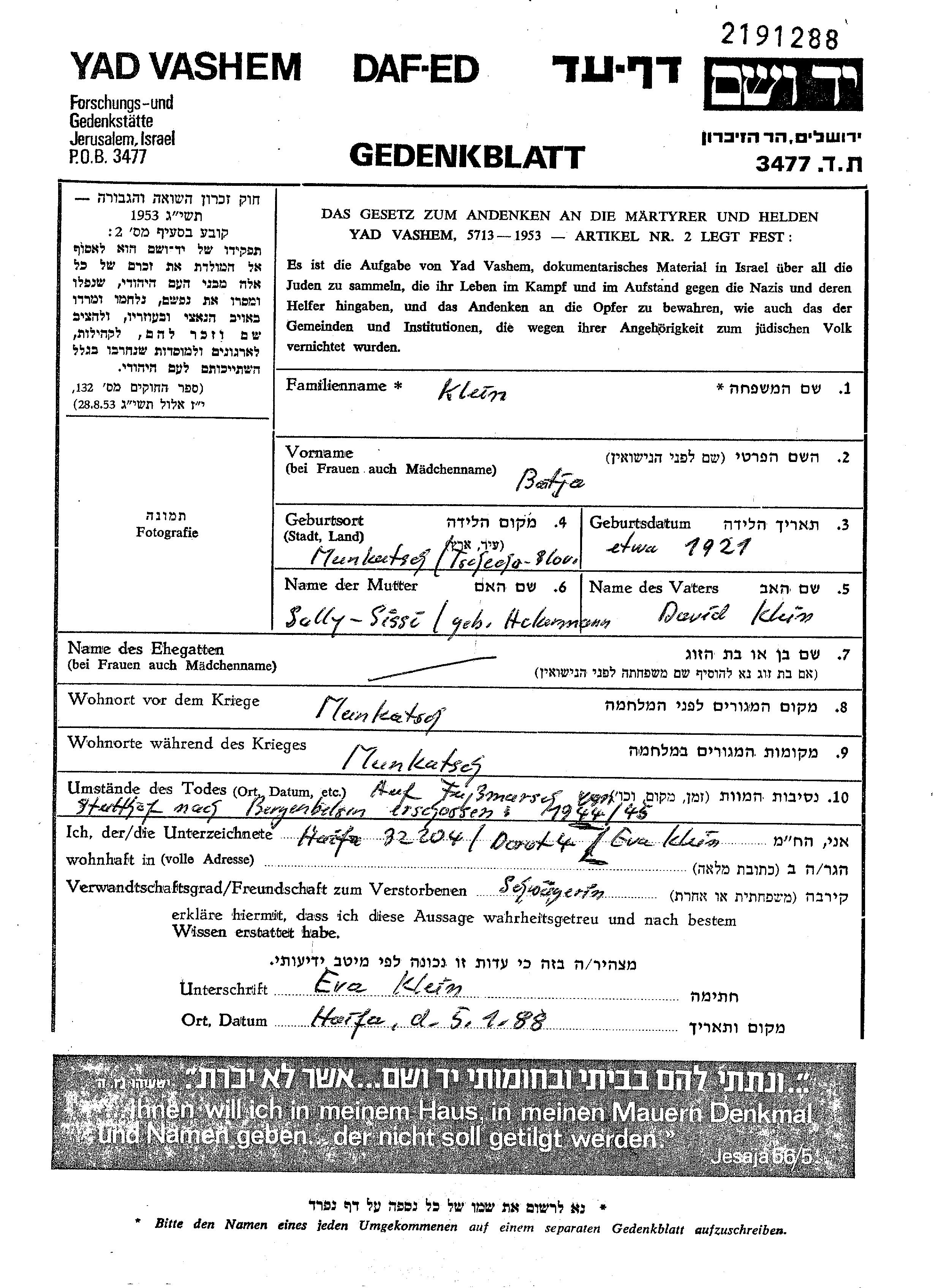 Klein Batja 1921 Munkacs, Tchécoslovaquie Feuille de témoignage