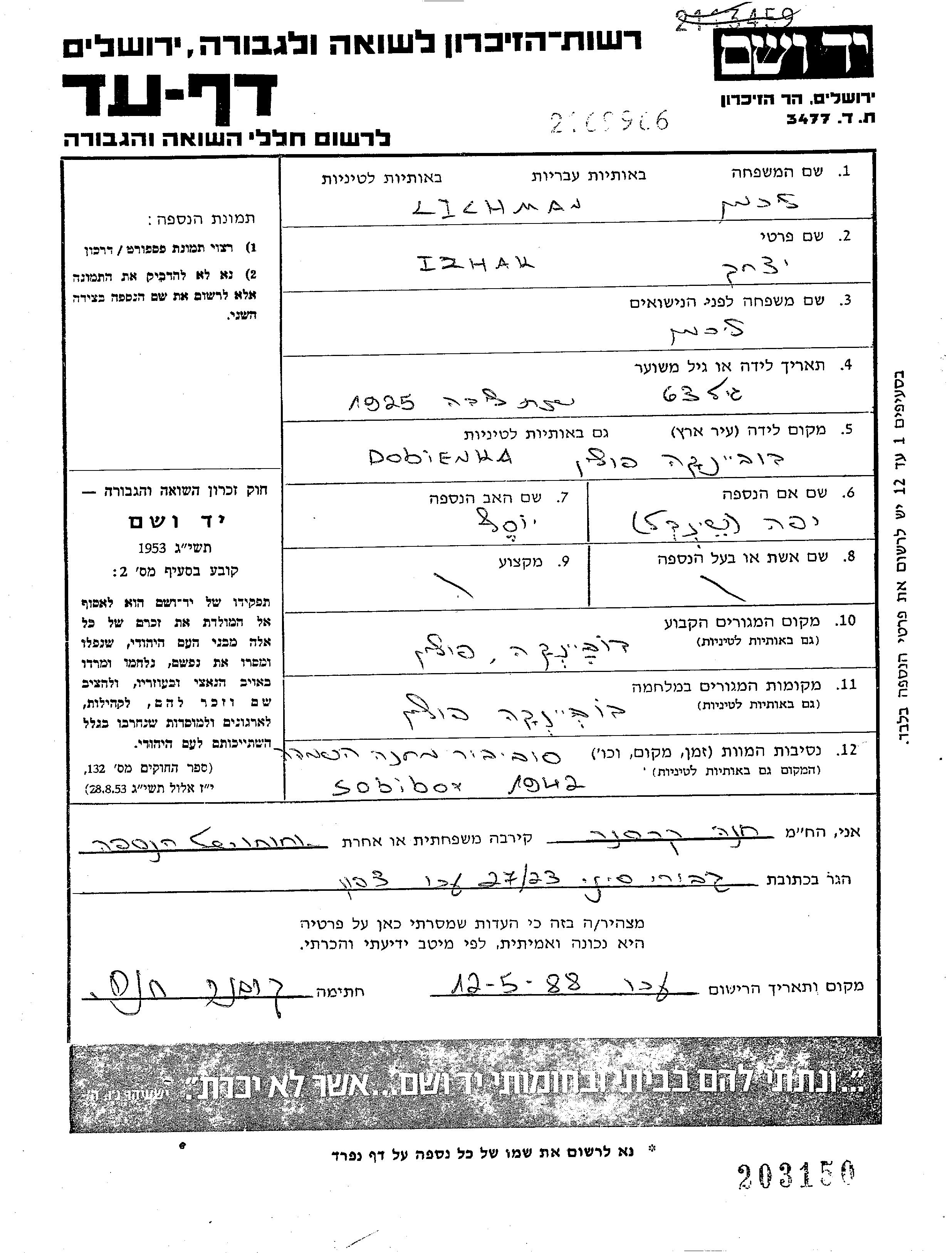 Lichman Izhak 1925 Dubienka, Pologne Feuille de témoignage