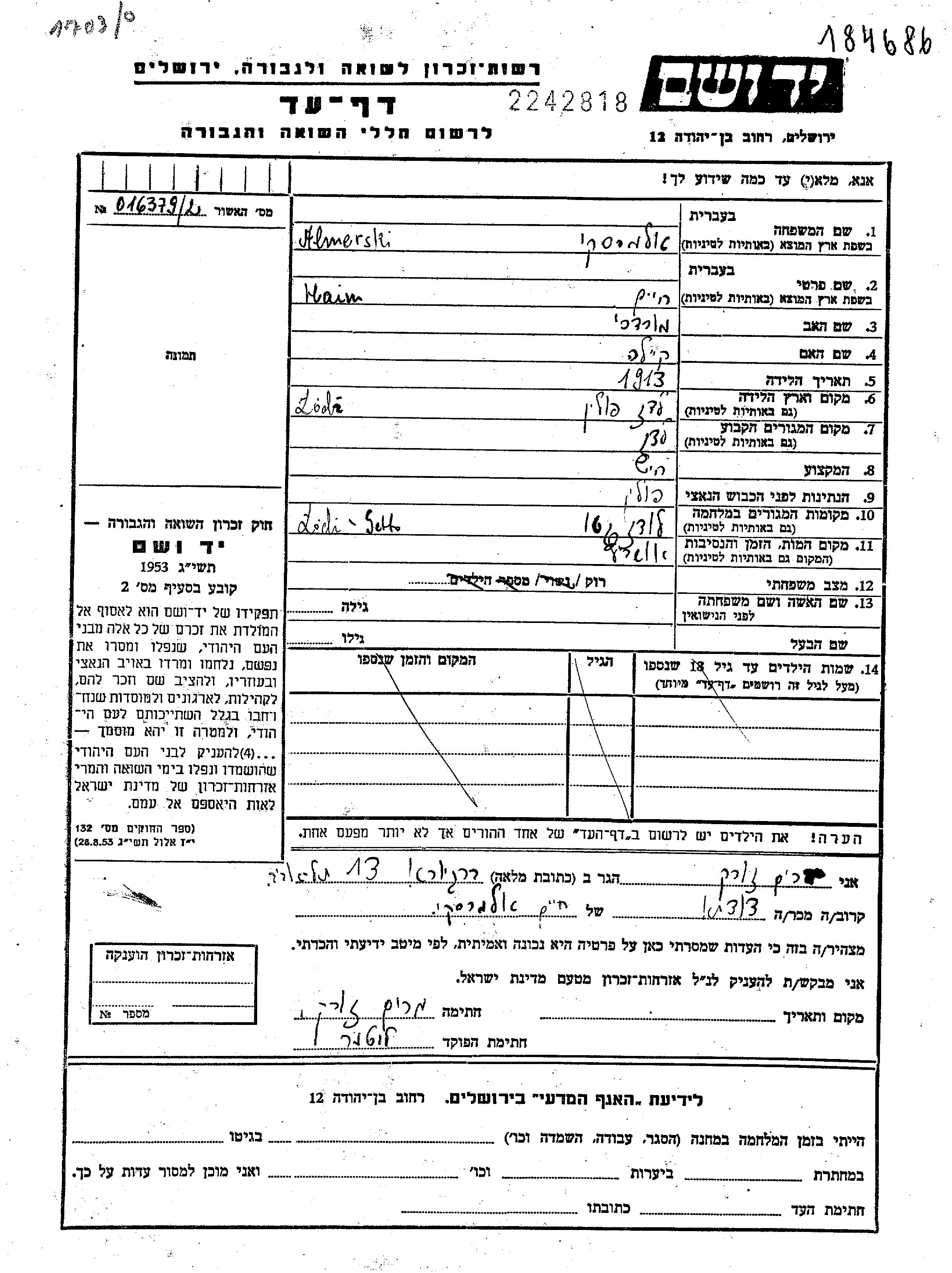 Haim Almerski est né à Lodz, Pologne en 1913, fils de Mordechai et de Keila. Il était Tailleur et Célibataire. Avant la seconde guerre mondiale il vivait à Lodz, Pologne. Au cours de la guerre, il était à Lodz, Pologne.