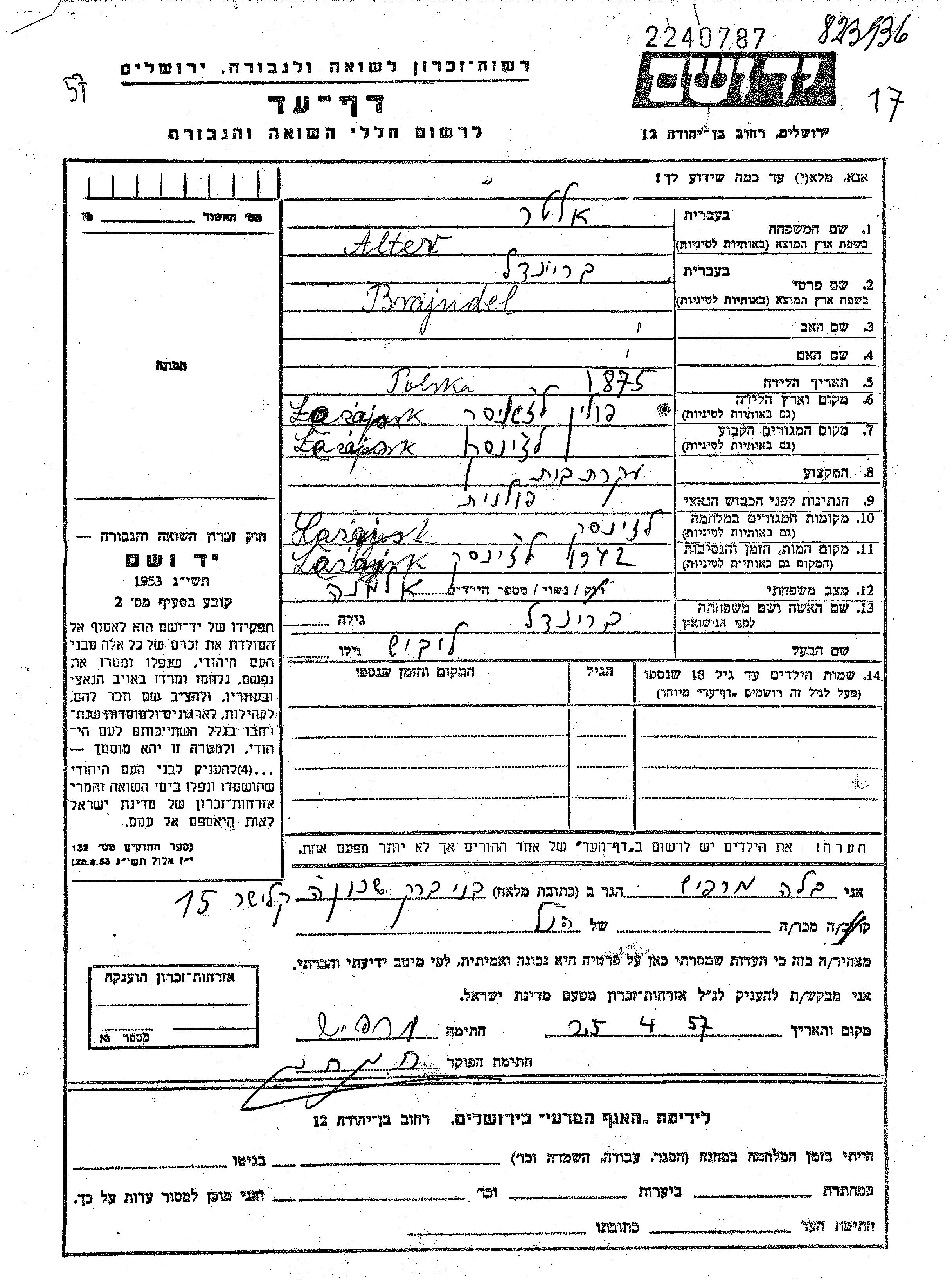 Brajndel Alter est née à Lezajsk, Pologne en 1875. Elle était Femme au foyer et Veufveuve Leibish. Avant la seconde guerre mondiale elle vivait à Lezajsk, Pologne. Pendant la guerre, elle était à Lezajsk, Pologne.