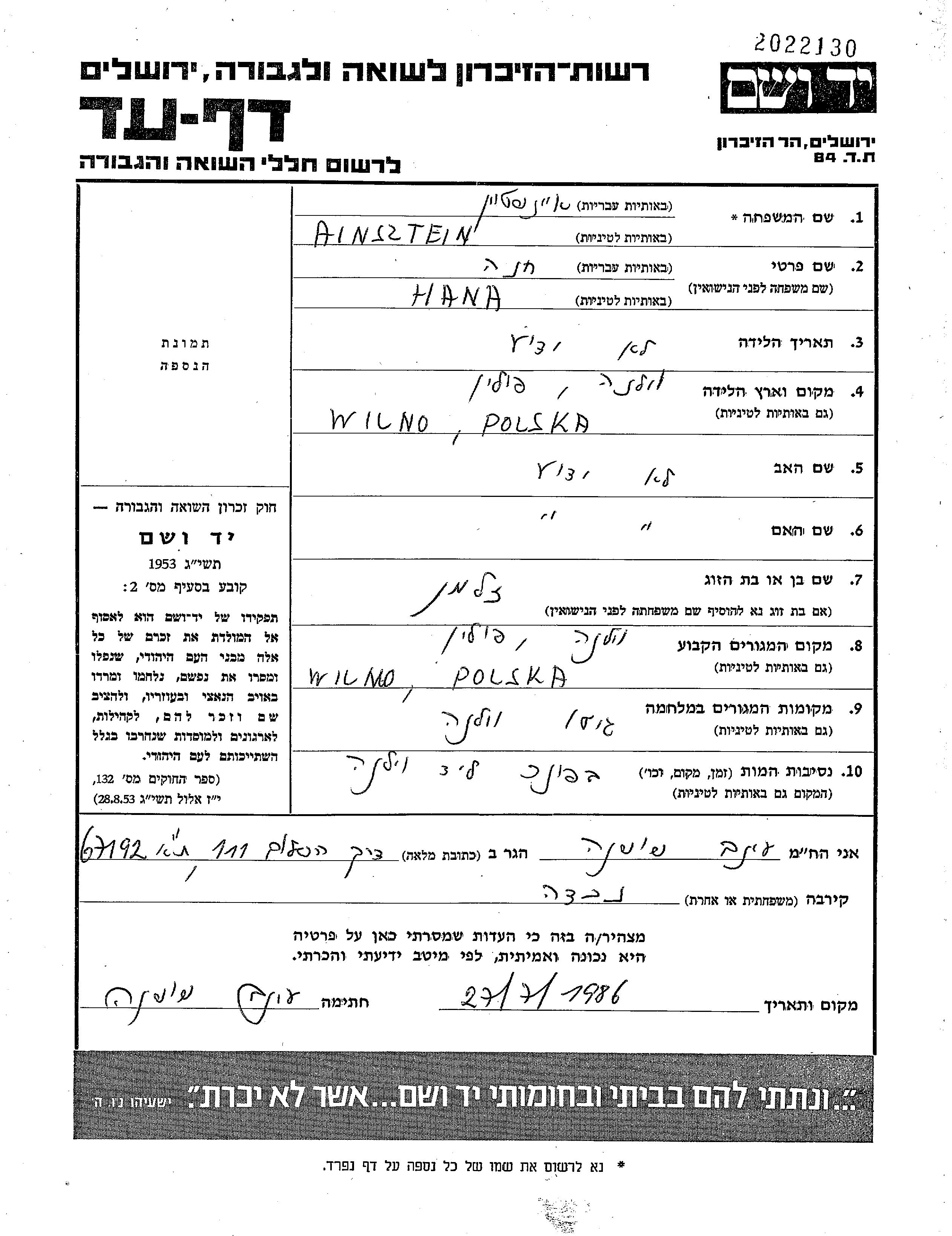 Ainsztein Hana Wilno, Pologne Feuille de témoignage