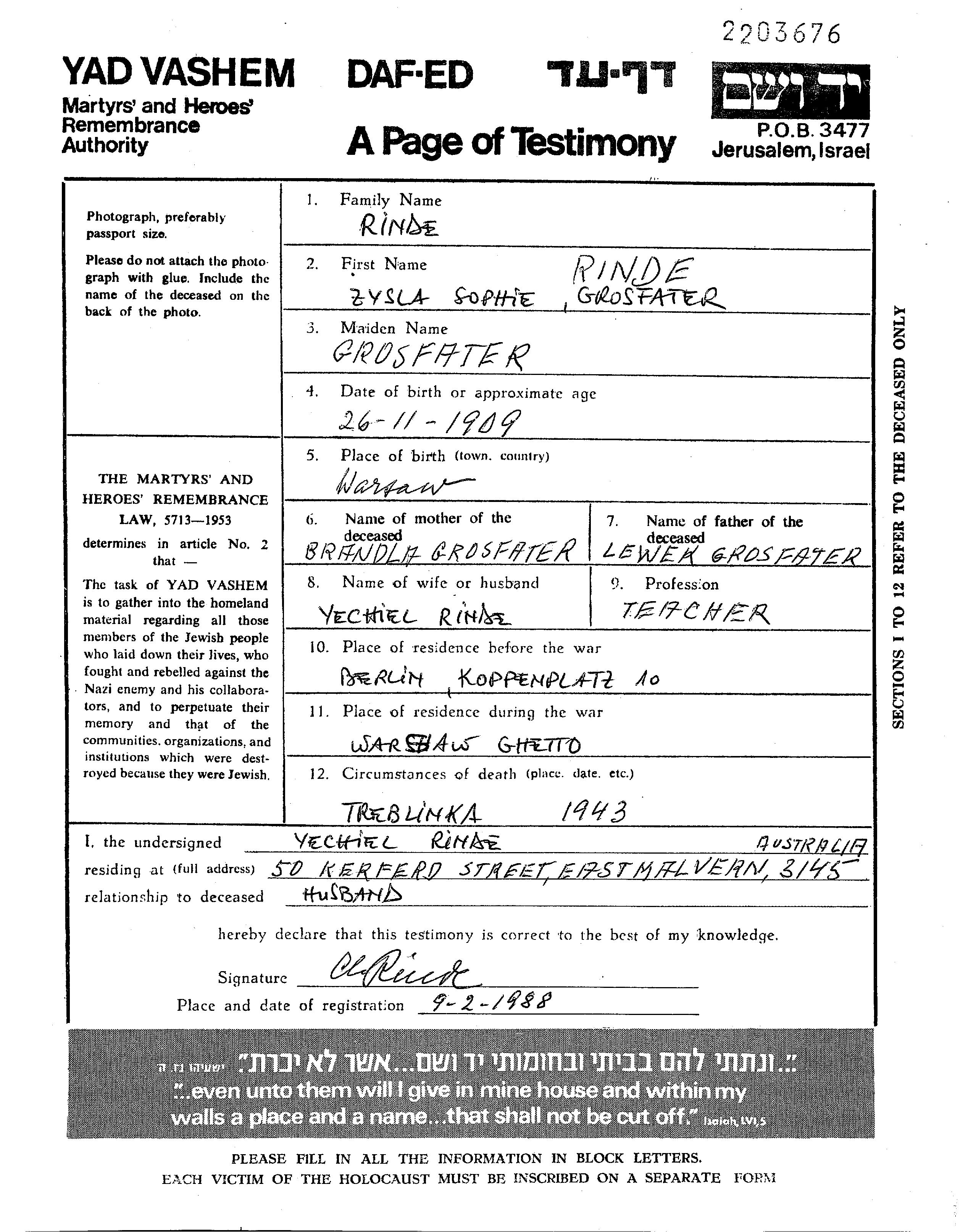 Zisla Sophie Rinde née Grosfater est née à Warszawa, Pologne en 1909, fille de Lewek Levik et de Brandla. Elle était Enseignant/e et Mariée à Yechiel. Avant la seconde guerre mondiale elle vivait à Berlin, Allemagne. Pendant la guerre, elle était à Warszawa, Pologne.