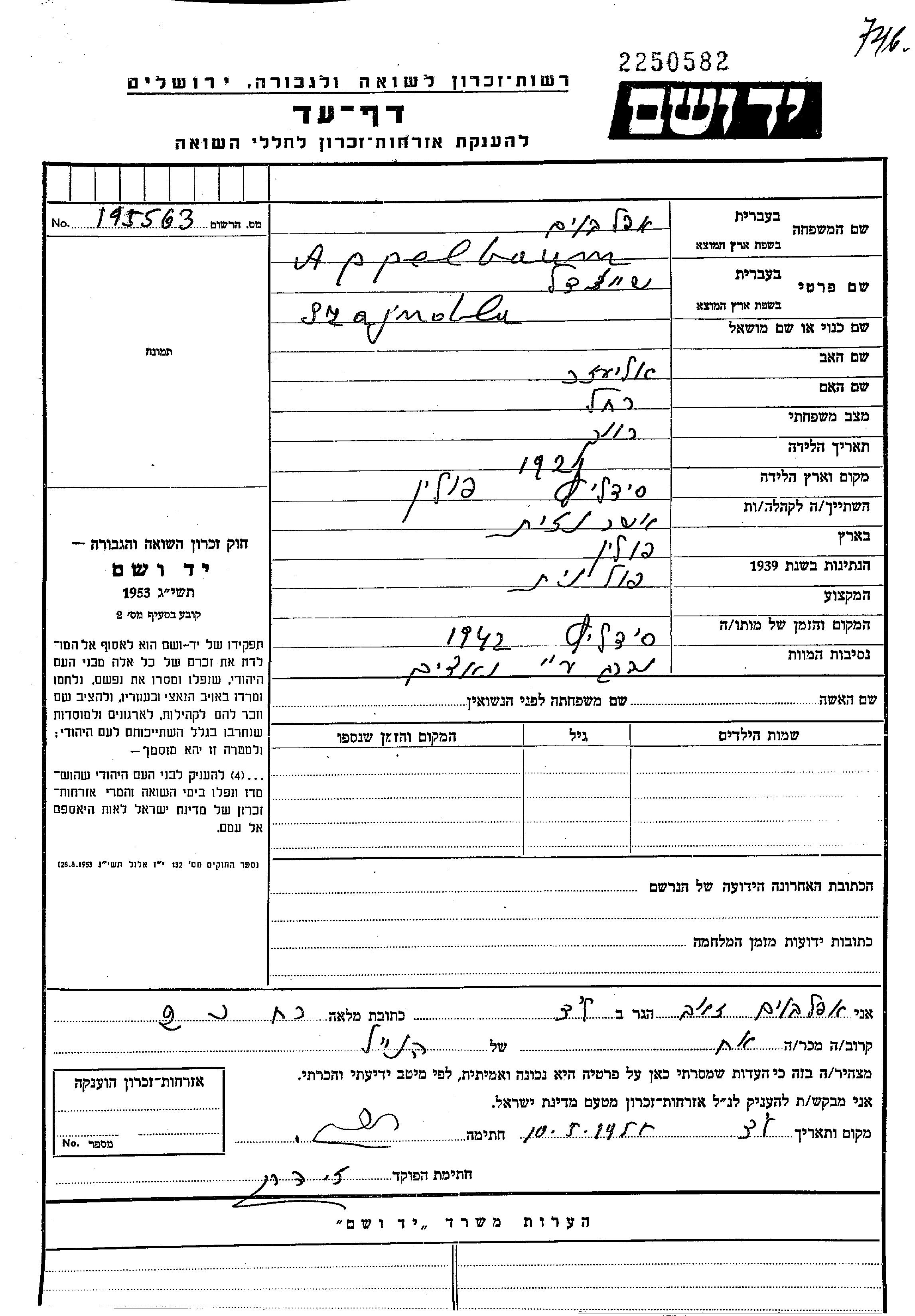 Yad Vashem - Pages of Testimony Names Memorial Collection