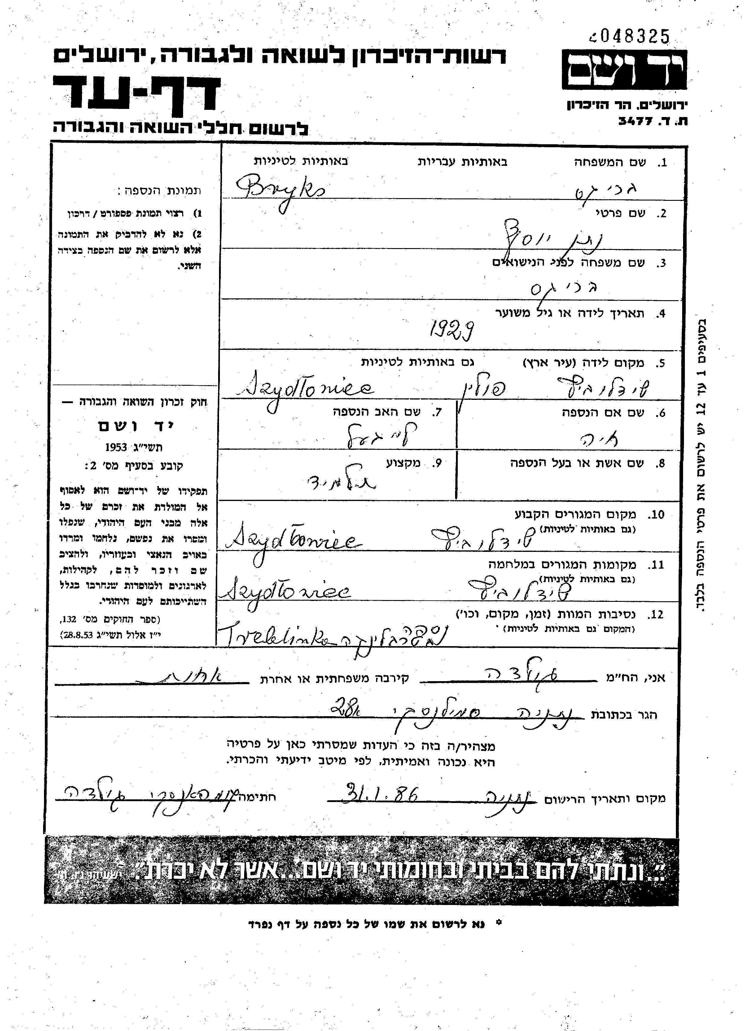 Bryks Natan Yosef 1929 Szydlowiec, Pologne Feuille de témoignage