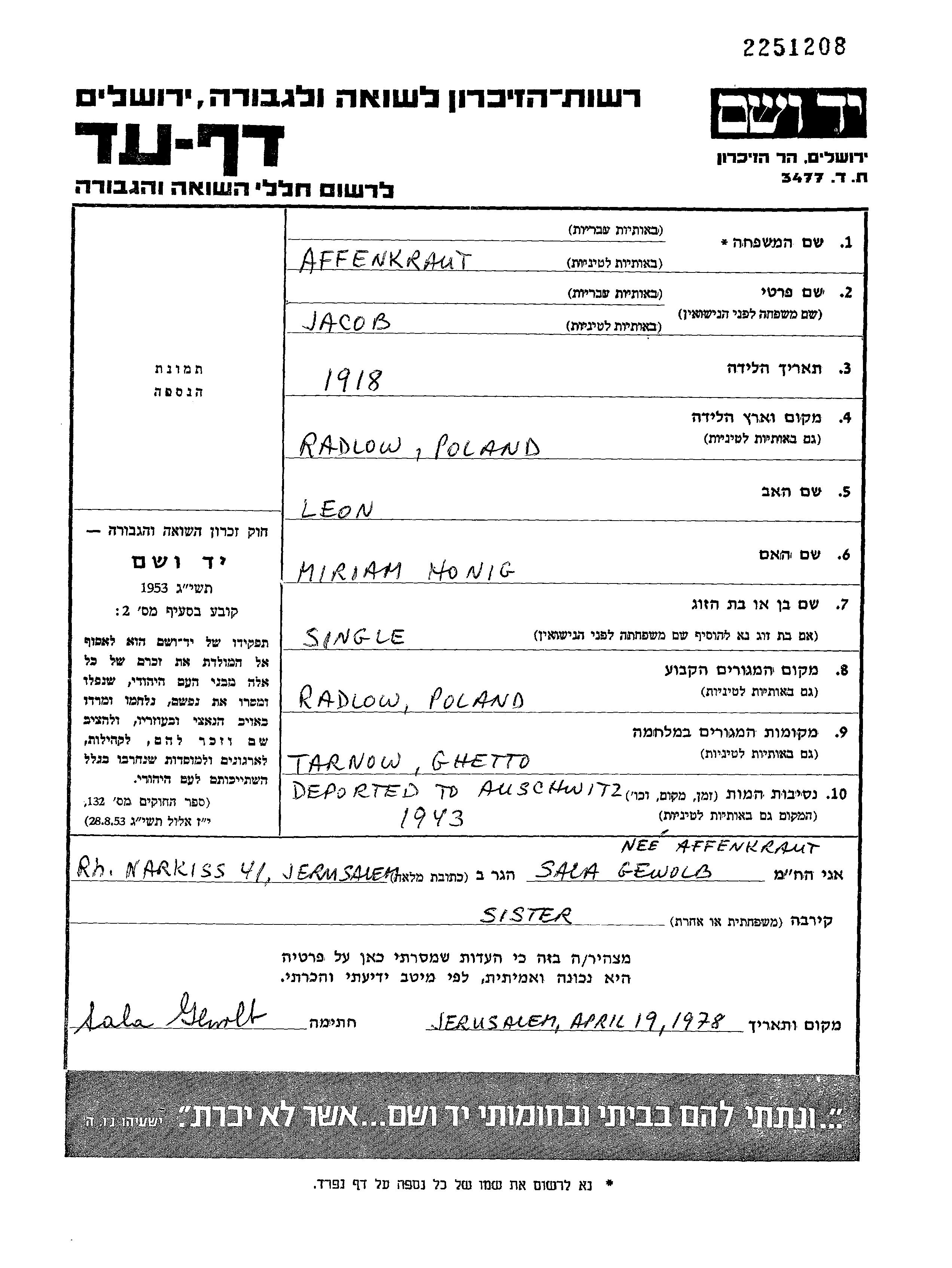 Jacob Affenkraut est né à Radlow, Pologne en 1918, fils de Leon et de Miriam née Honig. Il était Célibataire. Avant la seconde guerre mondiale il vivait à Radlow, Pologne. Au cours de la guerre, il était à Tarnow, Pologne.